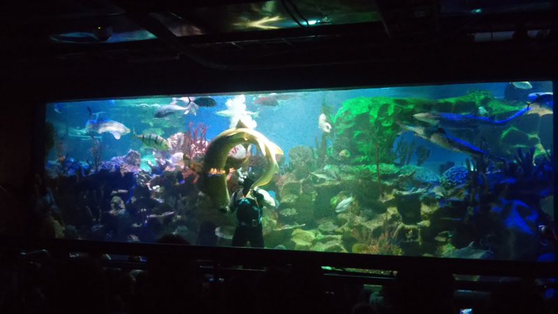 Океанариум не очень большой, но детям понравился. В 19-00 в океанариуме небольшое шоу акул (оно входит в стоимость билета 250р). От шоу дети были в восторге. Ведущая рассказывала о акулах, их жизни, а дрессировщик в аквариуме кормил их и делал небольшие трюки с ними - закручивал их в кольцо, танцевал с ними вальс . Был еще большой скат, его тоже кормил дрессировщик. Напротив аквариума сделан небольшой амфитеатр, на три ряда, чтобы смотреть шоу. Но народу гораздо больше, чем мест, поэтому заранее (примерно за 30 минут займите место). Я заняла, младший как раз спал в коляске, а старшие пока сами ходили по океанариуму.