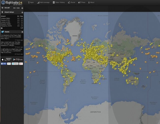 Можно понаблюдать в реальном времени за всеми самолетами, которые находятся в воздухе прямо сейчас.