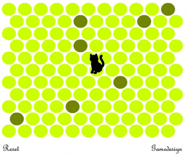 Очень захватывающая игра: нужно отмечать желтые кружочки вокруг кота зеленым, чтобы его поймать.