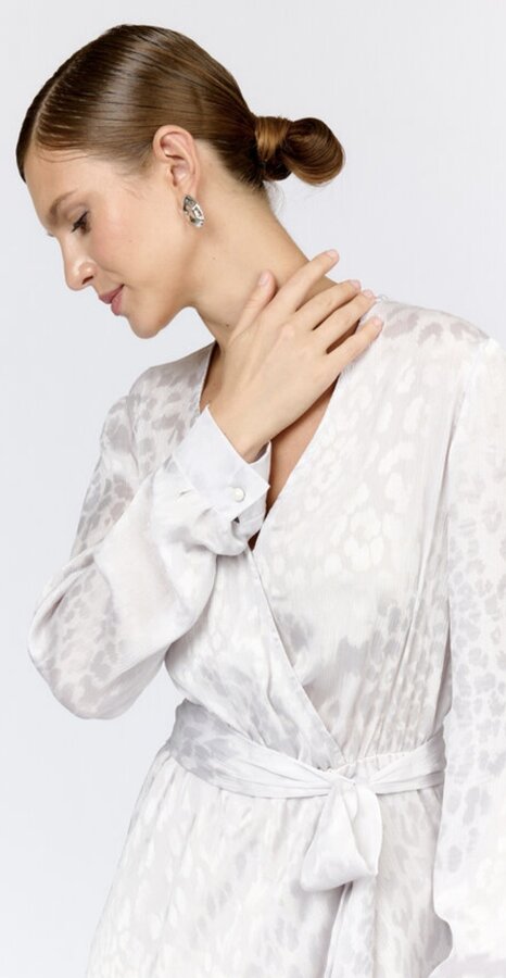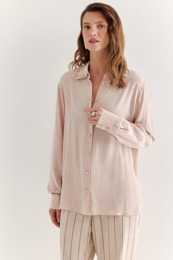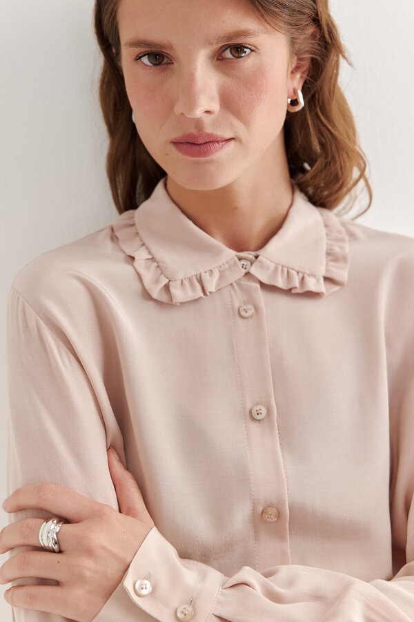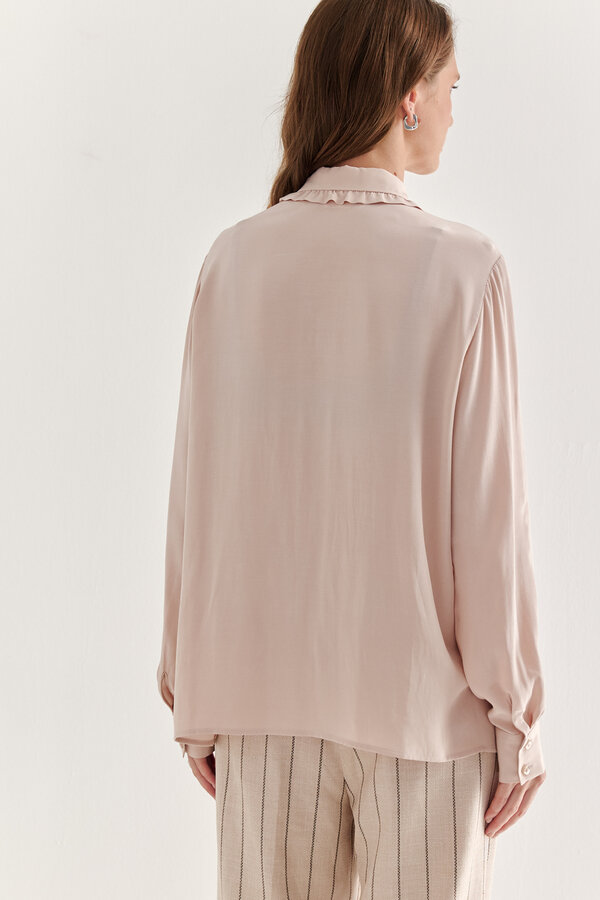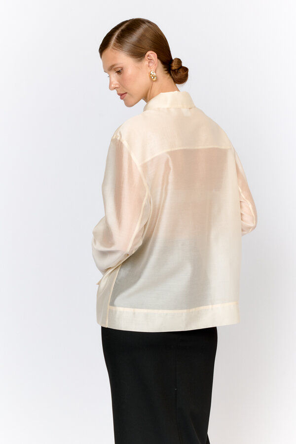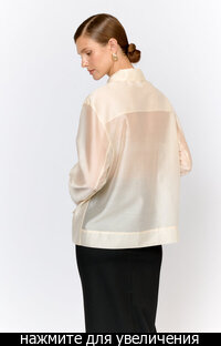 78 Блуза свободного кроя с легким расширением к низу с воланами и воротником-стойкой, переходящим в ленты, которые можно завязать в бант либо просто перекинуть через плечи. Выполнена из легкой полупрозрачной ткани с "крэш" Блузочный крэш-шифон цвета экрю (100% п.э.) 4200