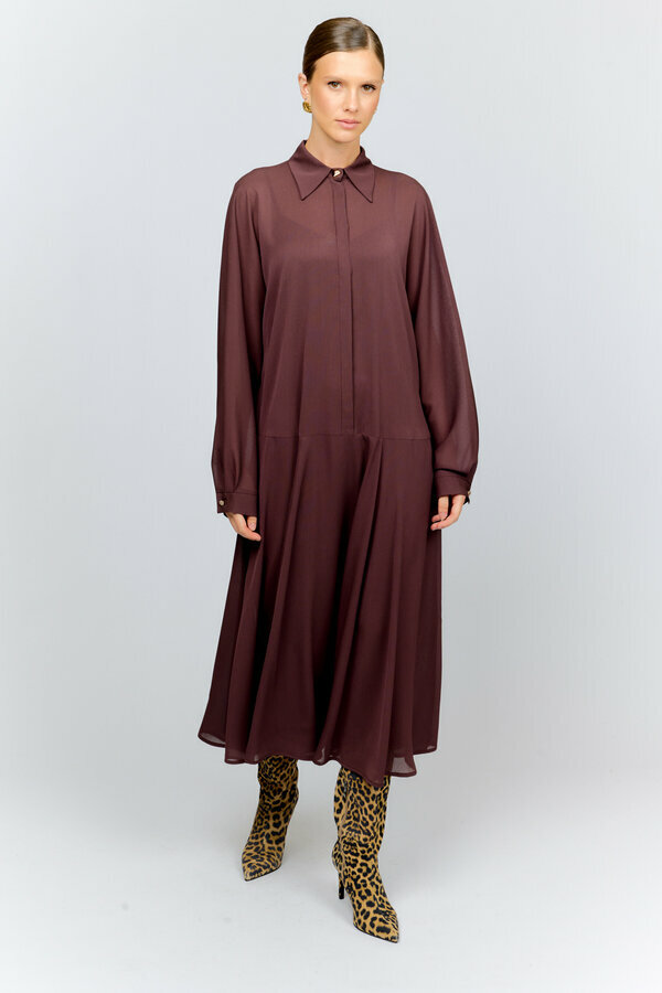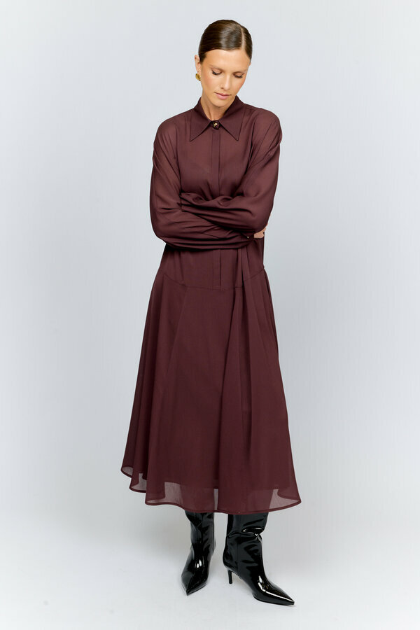 128 Платье рубашка с застежкой на пуговицы. Юбка отрезная со складками. Рукав со спущенной проймой полной длины Блузочный хлопок в цвете марсала (48% хлопок, 50% п.э., 2% спандекс) 3200 1500