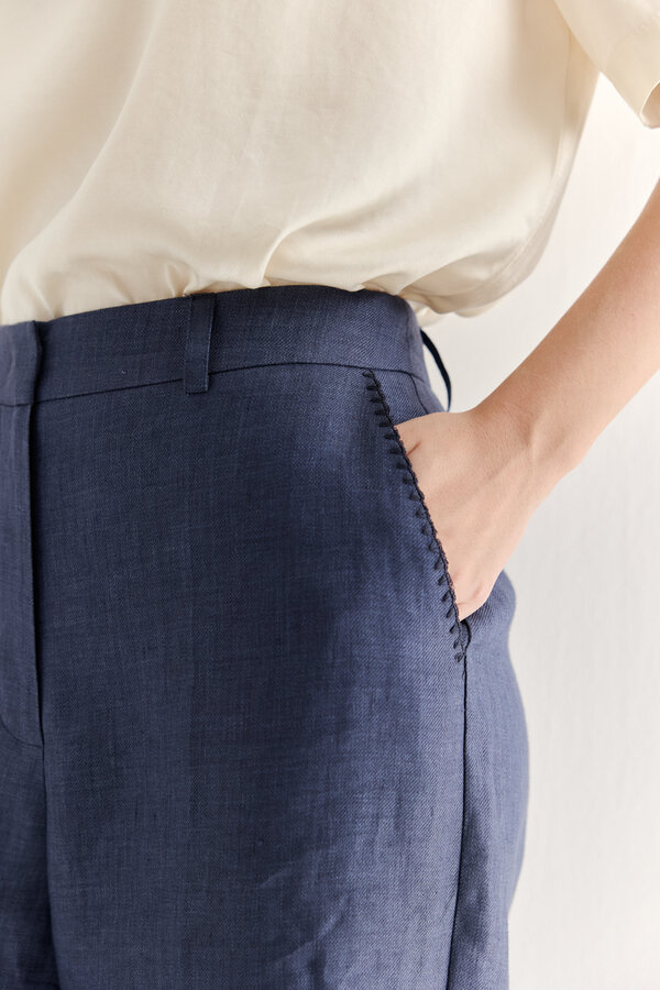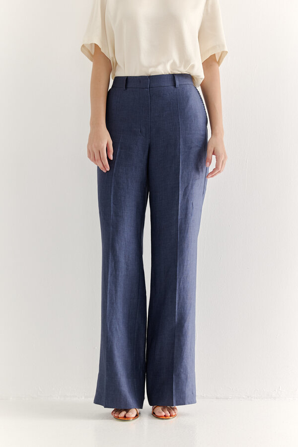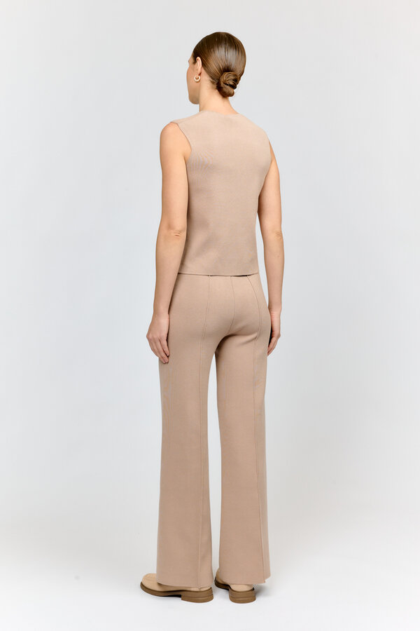 67 Брюки с небольшим клешем от колен с декоративной вшивкой по бокам.