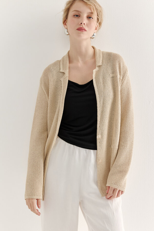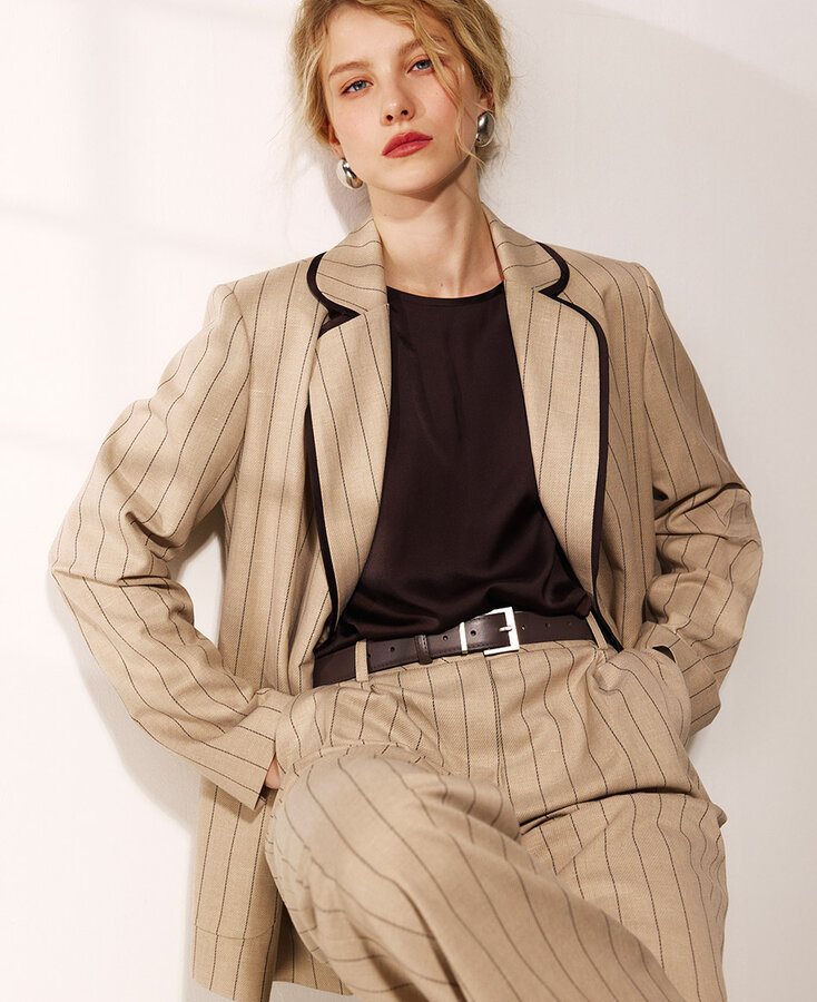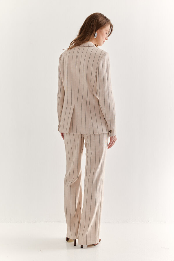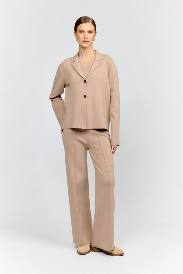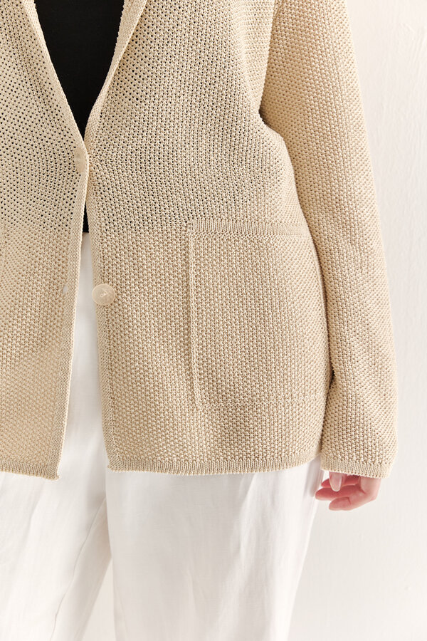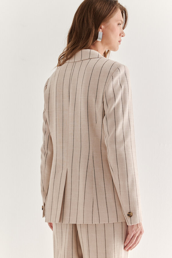 Двубортный жакет без подклада с лампасом по плечевому шву и рукаву. Воротник английский, низ рукава оформлен манжетой. TREND Вискоза креш костюмная с меланжевым эффектом натурального бежевого оттенка (75% район, 25% лен) 2870р