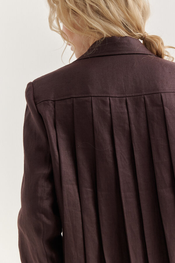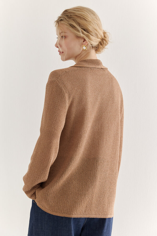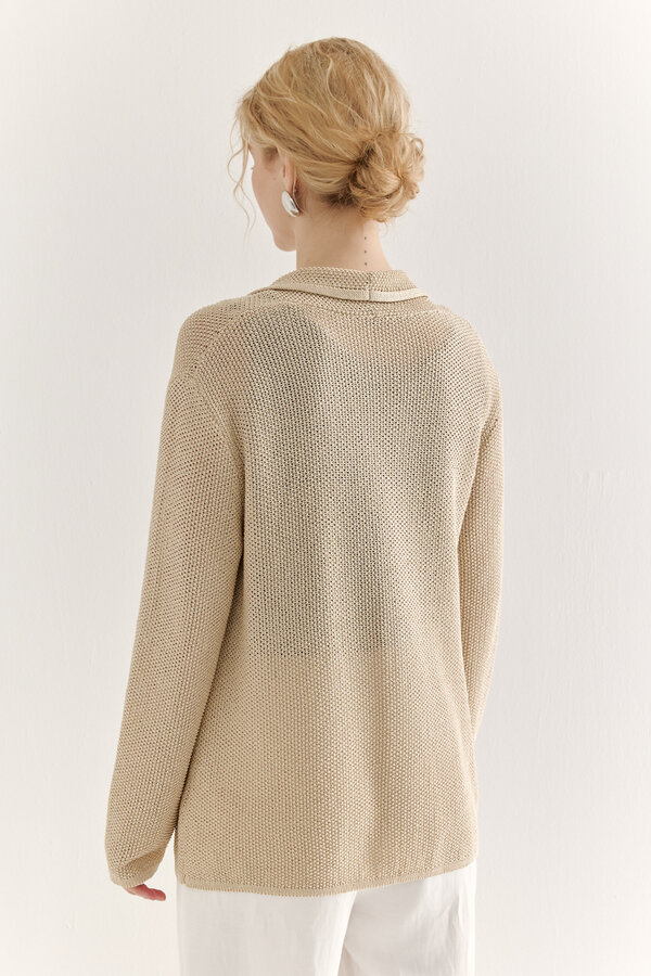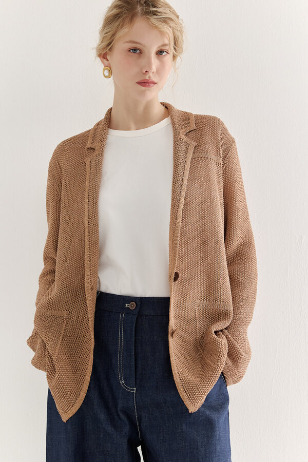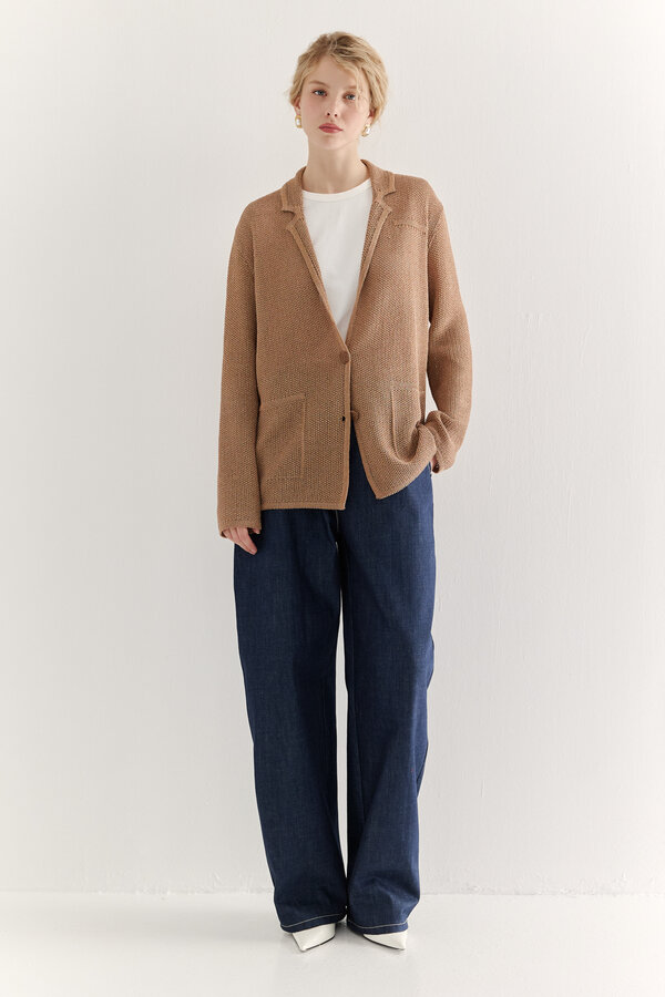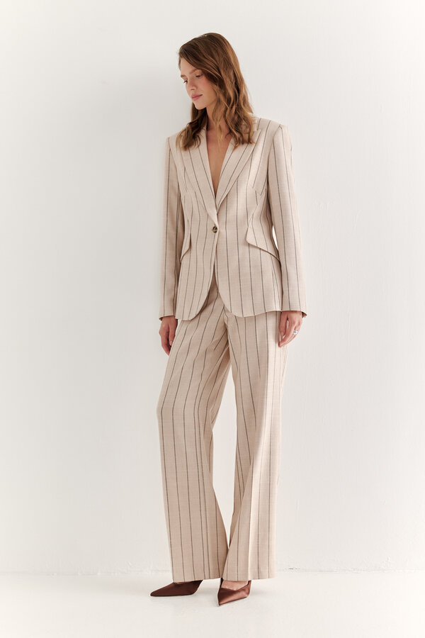 Двубортный жакет без подклада с лампасом по плечевому шву и рукаву. Воротник английский, низ рукава оформлен манжетой. TREND Вискоза креш костюмная с меланжевым эффектом натурального бежевого оттенка (75% район, 25% лен) 2870р