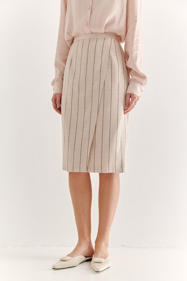 11 Юбка А-силуэта с эффектом на запах с посадкой на линии талии с боковыми карманами и декоративными отстрочками создаёт геометричный архитектурный акцент и прекрасно комплектуется с жилетом в той же ткани. Premium quality Костюмная ткань премиального качества, рогожка светло- бежевого цвета ткань с фабрики Burberry. Италия (100% шерсть) 4900