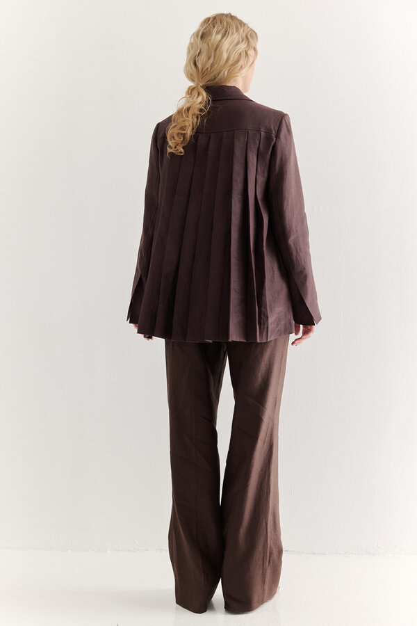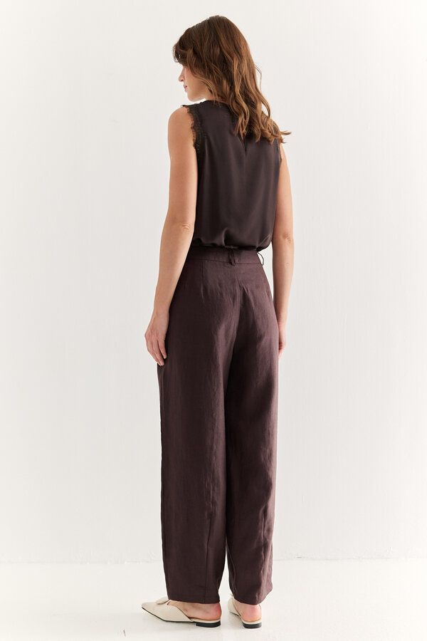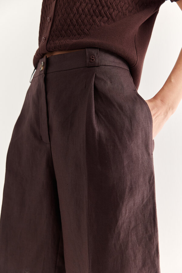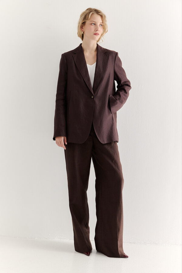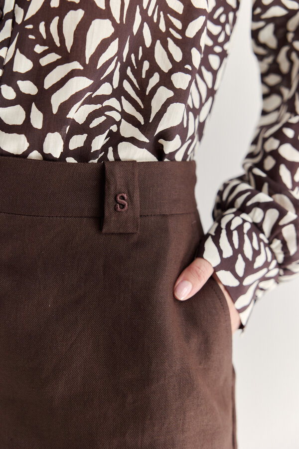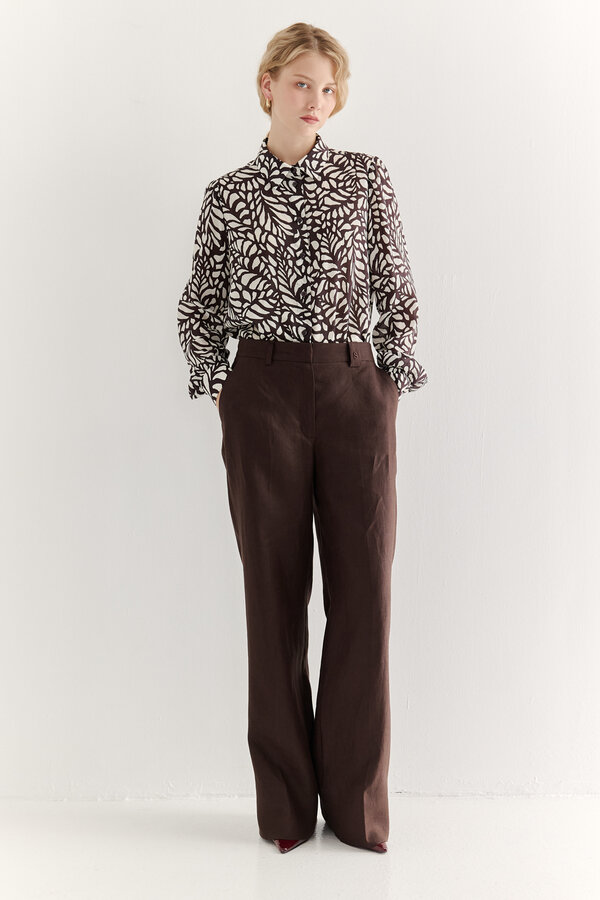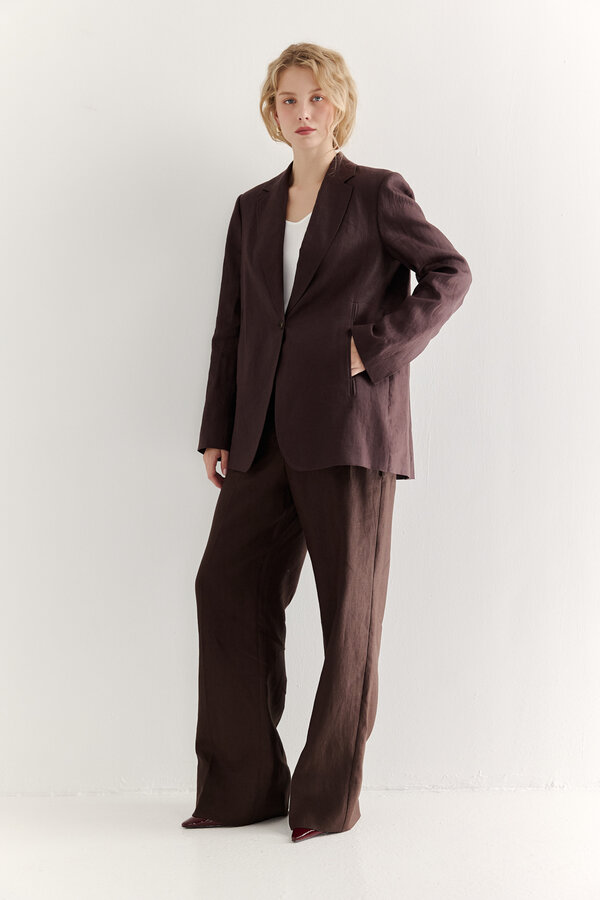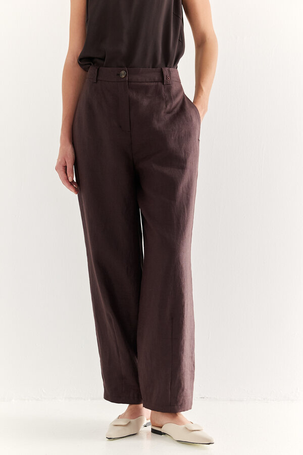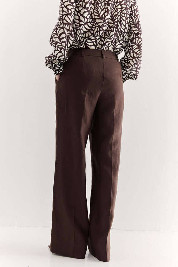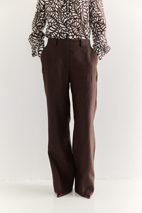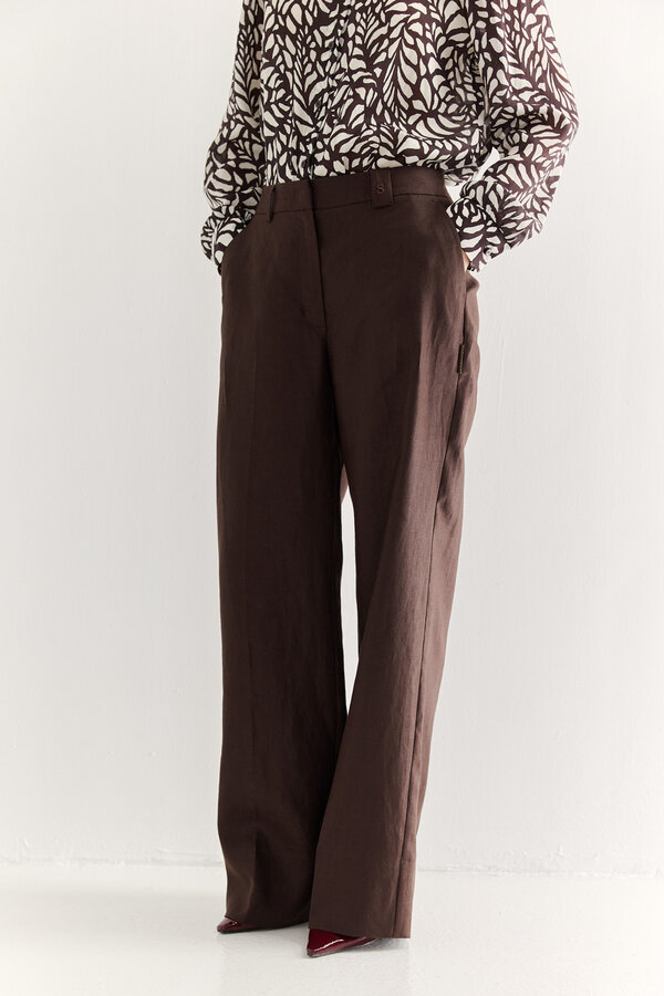 33 Брюки прямого силуэта со стандартной посадкой. Костюмная ткань коричневого цвета (77% терилен, 18% район, 5% спандекс) 3400