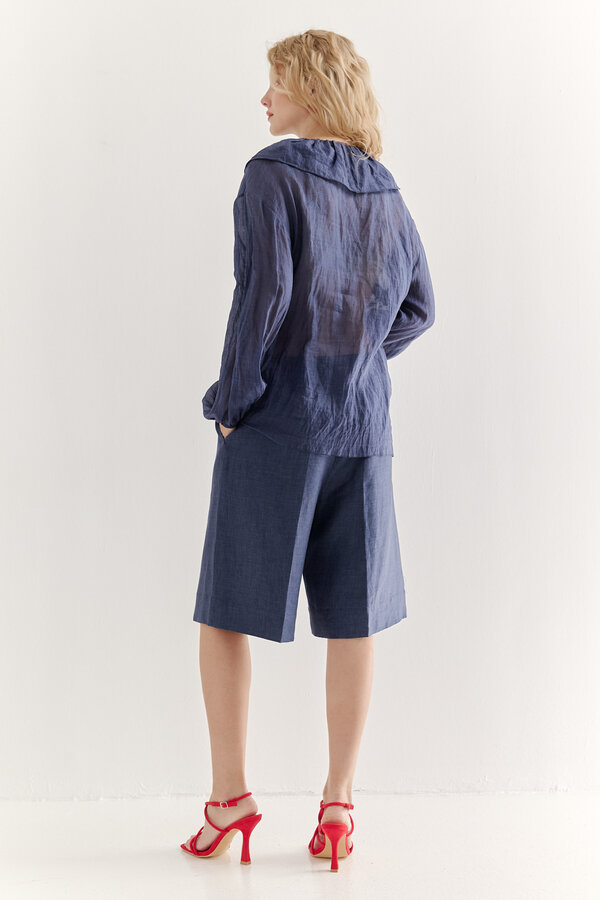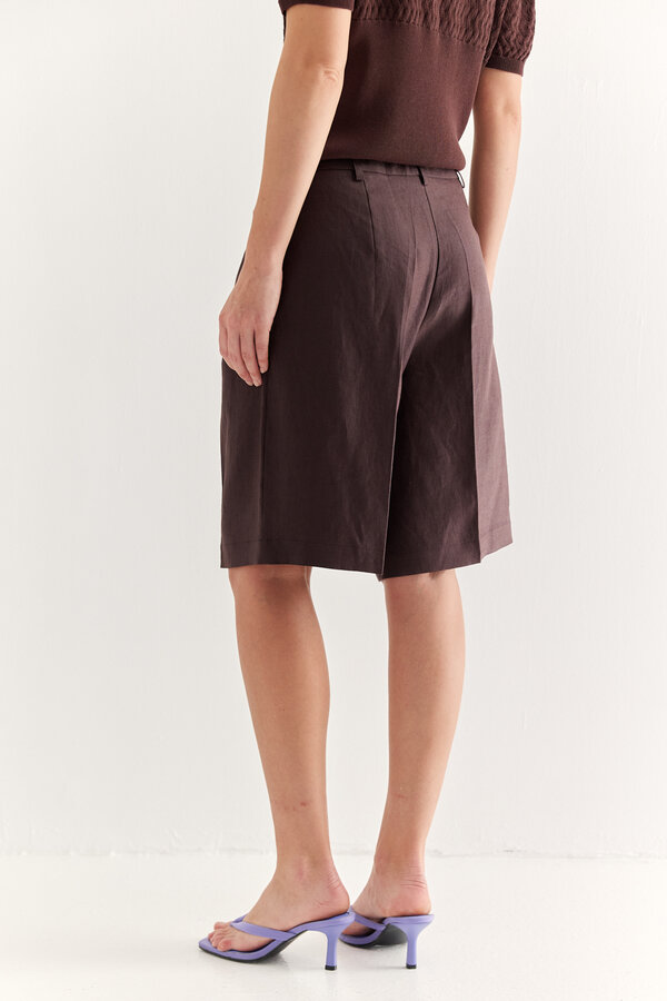 Шорты-юбка длиной мини с имитацией запаха по передней части. Посадка на талии. PREMIUM QUALITY TREND Лен костюмный в диагональную выработку с благородным блеском с меланжевым эффектом натурального бежевого цвета (55% лен, 45% район) Цена 1900 руб. Размер 42