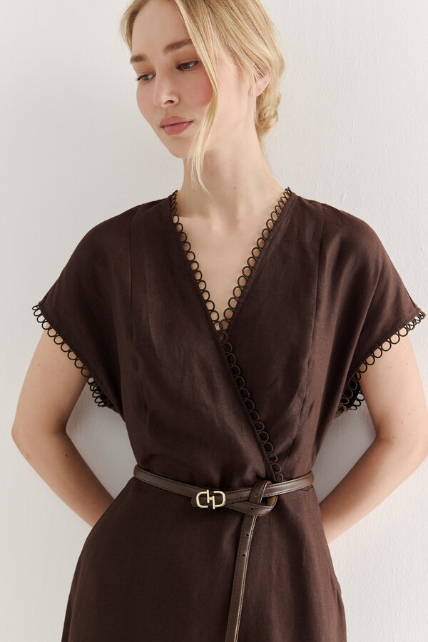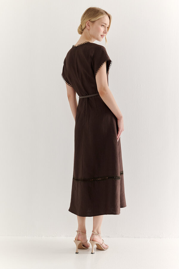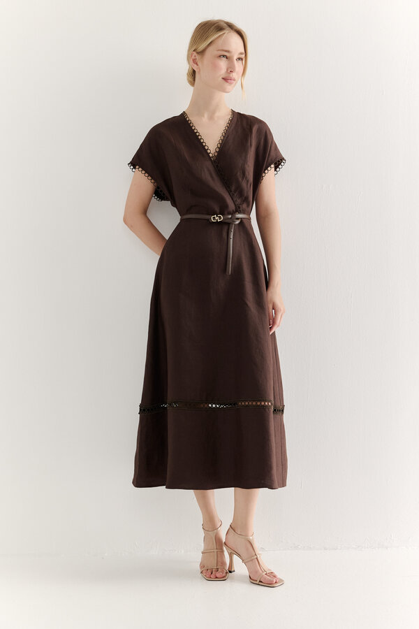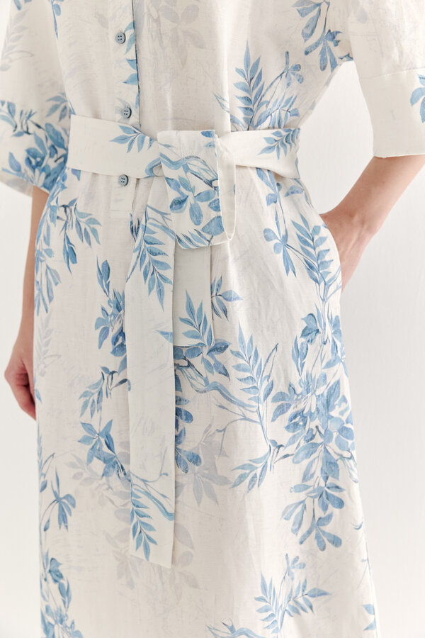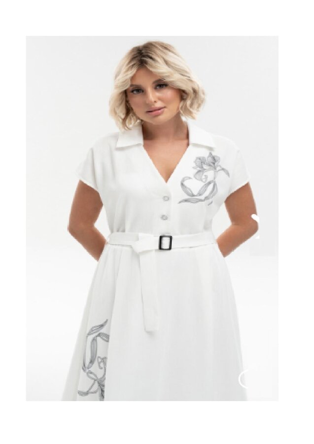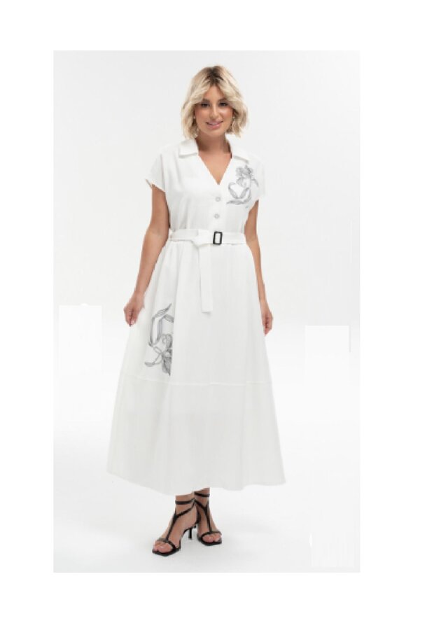 23 Платье с коротким пышным рукавом длины миди. Вышивка "цветы" на рукавах. PREMIUM QUALITY Лен плательно-костюмный премиального качества бежевого цвета Вышивка цветы (100% лен) 5880