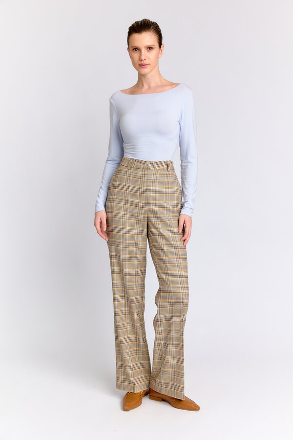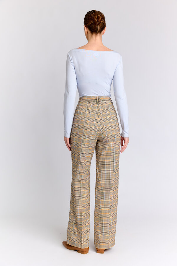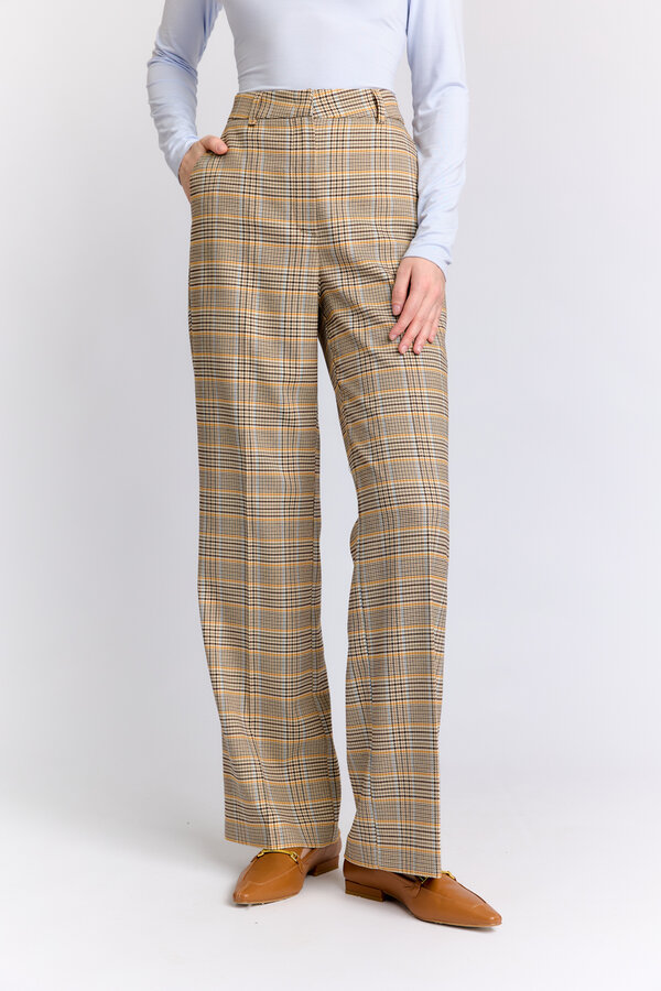 103 Брюки зауженного силуэта длиной до щиколотки. Костюмная ткань в серо-желтую клетку (64% п.э., 33% район, 3% спандекс) 2650 1000