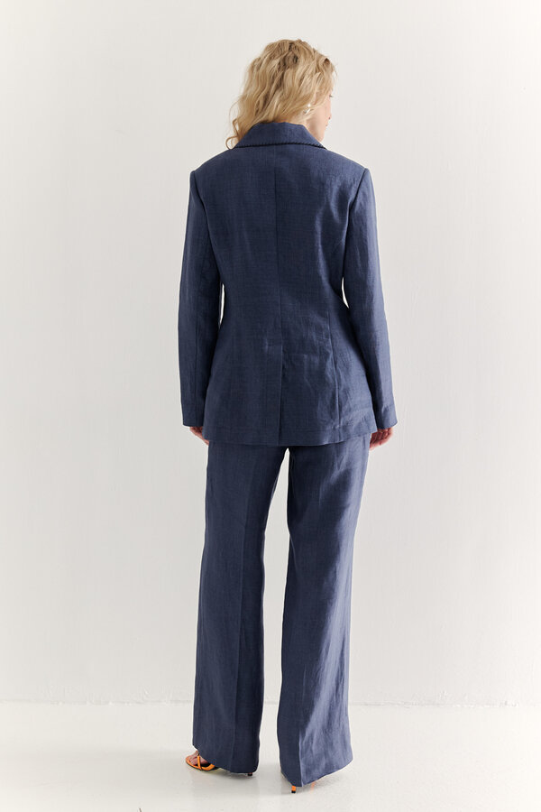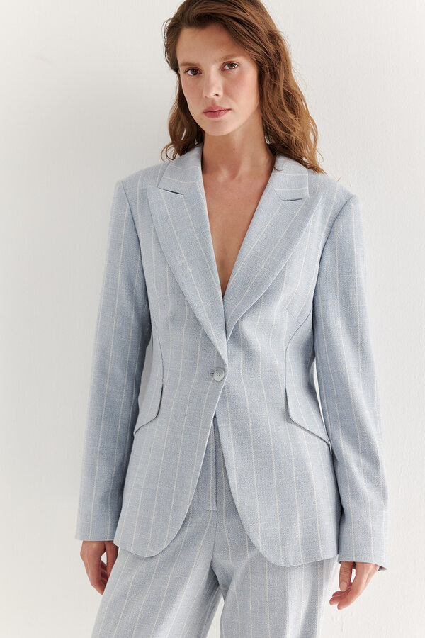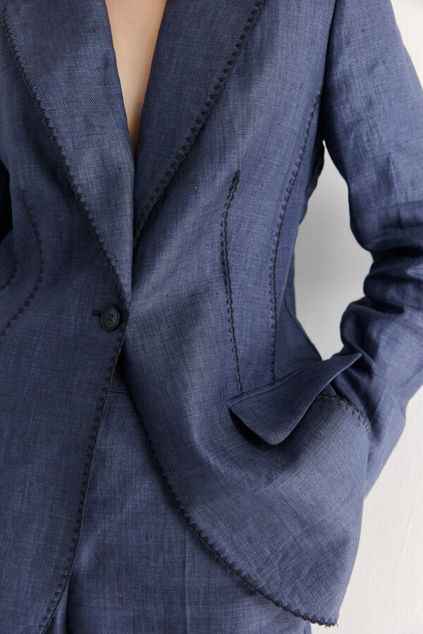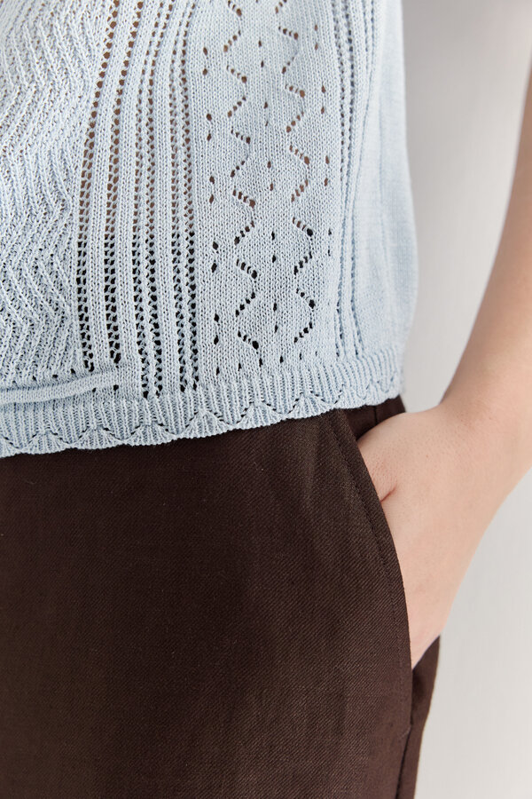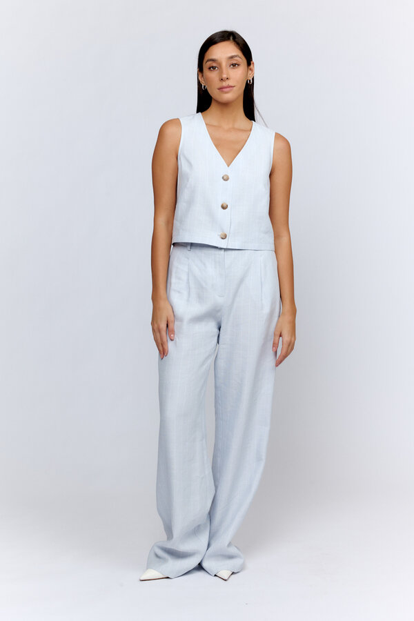 50 Удлинённый двубортный жилет с английским воротником отделанный ручной строчкой. По боковым швам расположены разрезы. NEW, PREMIUM QUALITY Костюмная ткань твил нежно-голубого цвета (66% полиэстер, 29% вискоза, 5% спандекс) 4800 3000
