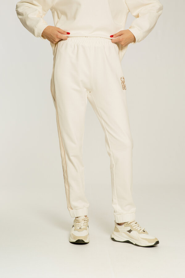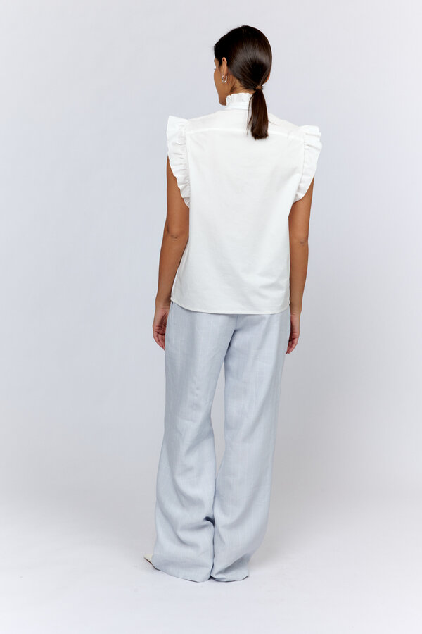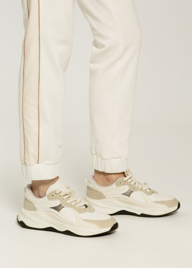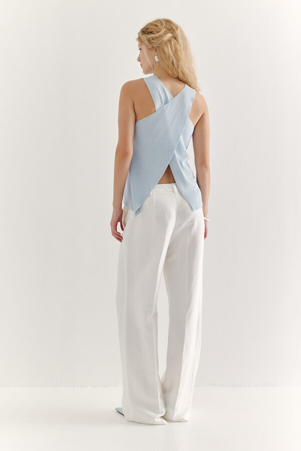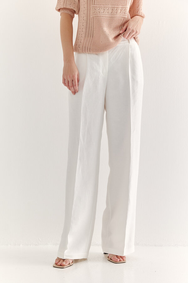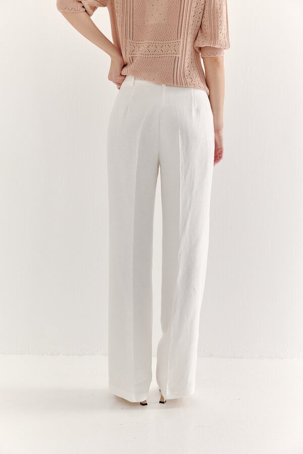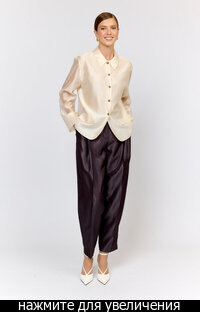 Брюки классической посадки с защипами , карманы в подрезном бочке, на задней половинке декоративная прорезная рамка. На подкладе. TREND PREMIUM QUALITY Легкая костюмная техноткань белого цвета с крэш эффектом (59% район, 35% п.э., 6% нейлон)