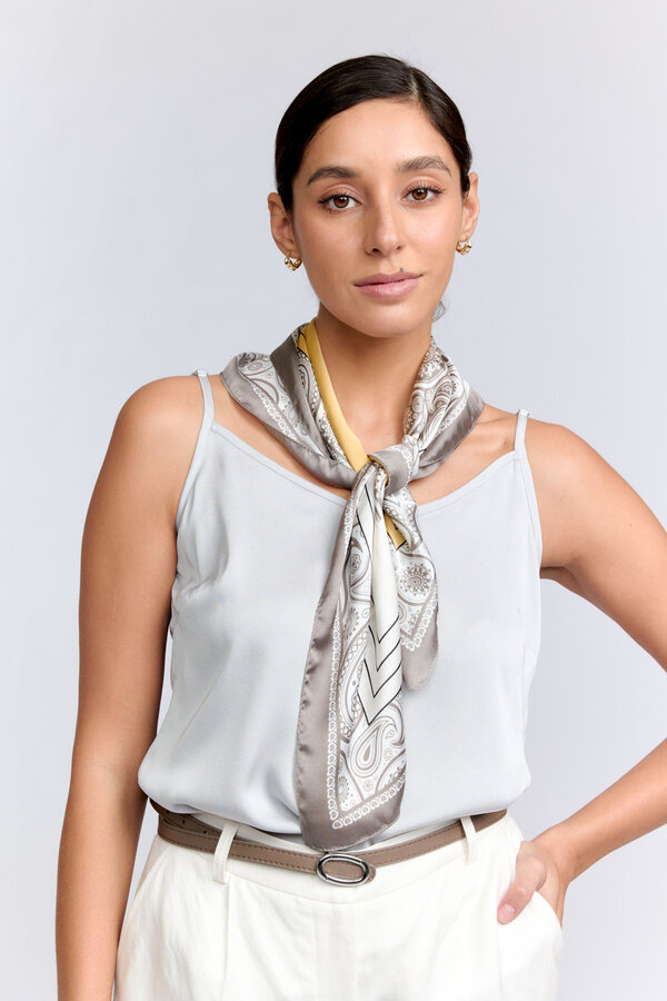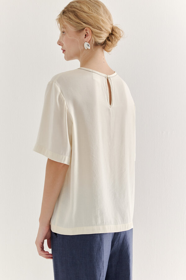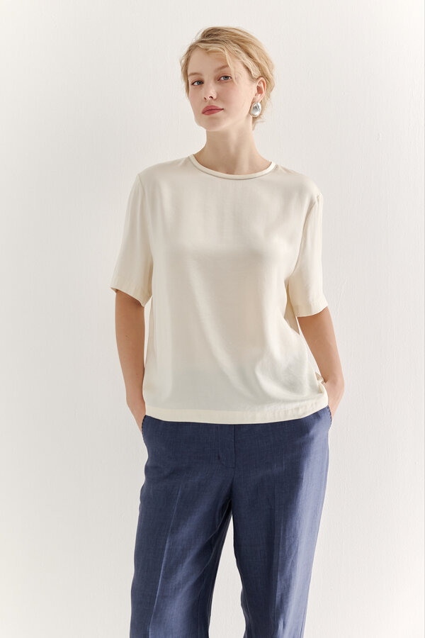 11 Топ с короткими рукавами. TREND PREMIUM QUALITY Струящаяся атласная вискоза пастельного оливкового оттенка с жемчужным переливом (50% вискоза, 50% район) 1800 1500