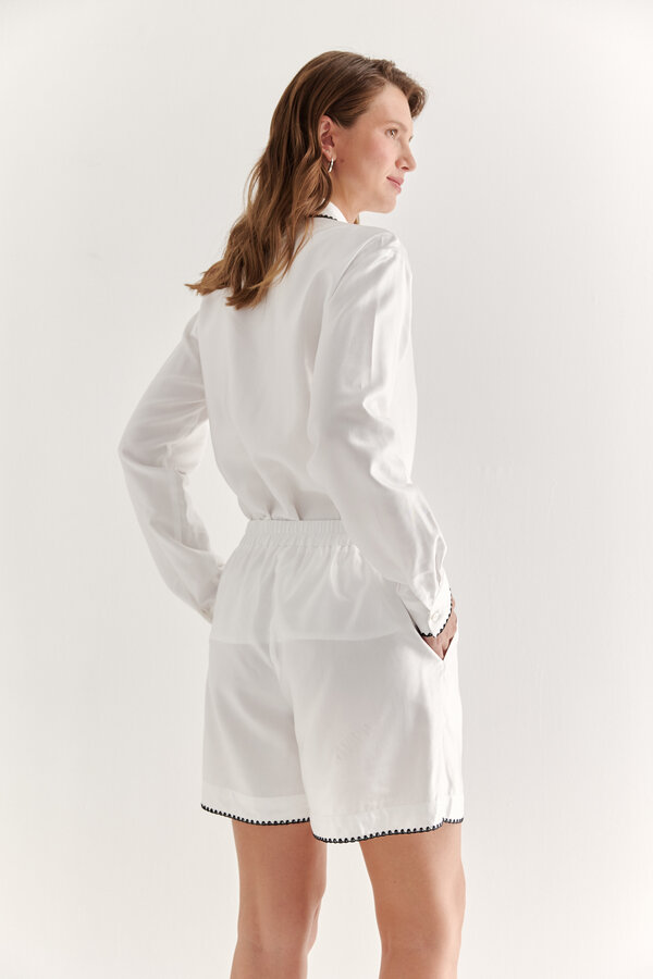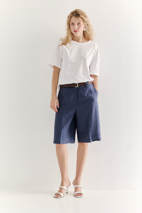 28 Шорты свободного кроя с защипами. Длина до колен. Застежка на пуговицу и молнию. PREMIUM QUALITY Костюмный хлопок белого цвета (97%хлопок, 3%эластан) 3350