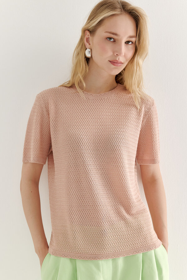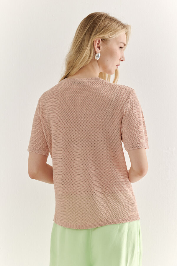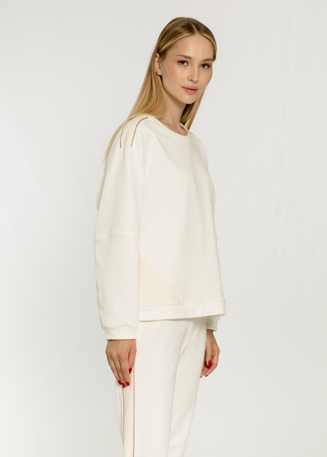 Футболка свободного силуэта с открытыми срезами, с кокетками по полочке и спинке, рукав-крылышко. TREND PREMIUM QUALITY Хлопковый фактурный легкий костюмный трикотаж бежевого цвета (100% хлопок) (номер вещи 36 коллекция Лето 2021 часть 1 размер 42 )