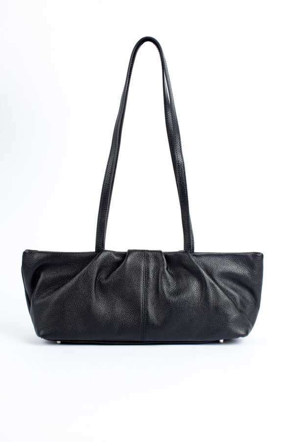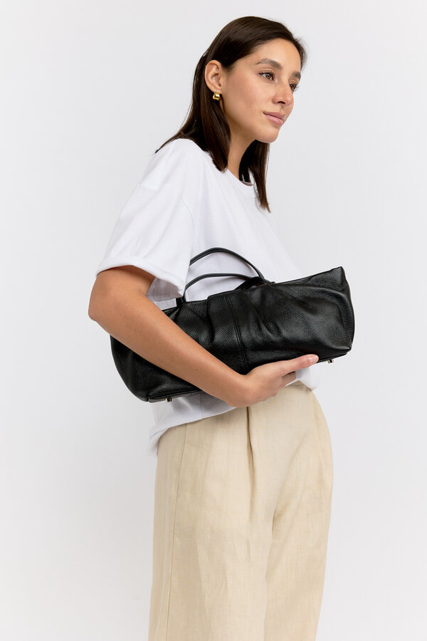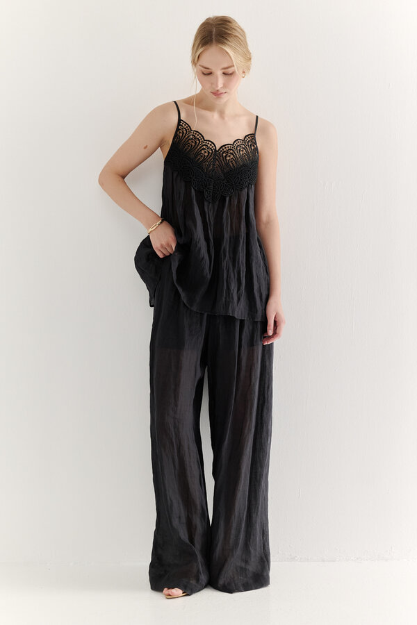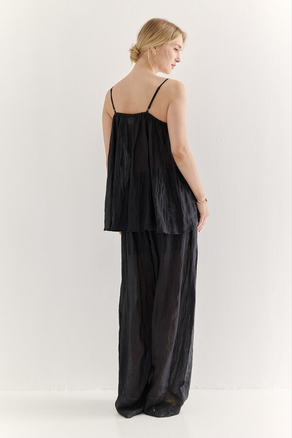 Брюки свободного силуэта, зауженные к низу. Талия по спинке на резинке. Карманы в подрезном бочке с регулируемой кулисой на фиксаторе. PREMIUM QUALITY Плательно-блузочный хлопок насыщенного черного цвета с эффектом silk touch (100% хлопок)