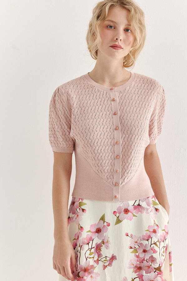 33 Укороченный жакет свободного кроя на одну пуговицу из твидовой ткани с мерцающими пайетками. Спереди накладные карманы с пуговицами. Мягкий костюмный твид с пайетками в цвете "пыльная роза" (30% вискоза,10% хлопок,60%терилен) 6100