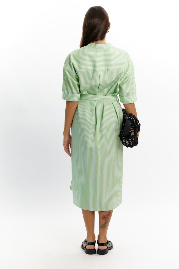 Двубортное платье-жилет с английским воротником, отрезной по линии талии с поясом, на плечах имеются паты. Длина миди. Твилл хлопковый в диагональную выработку в трендовом цвете Сафари (55% тенсель, 45% хлопок)
