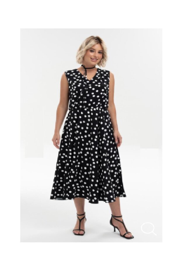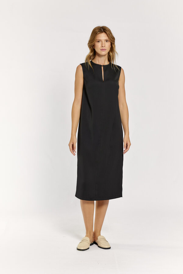 34 Полуприлегающее платье с отрезной линией талии элементом узда по ней. Рукав втачной прямой. Вырез горловины круглый. Длина до середины икр. 98 %терилен, 2% п.э. TREND NEW PREMIUM QUALITY Креп плательный черного цвета 2700 1500