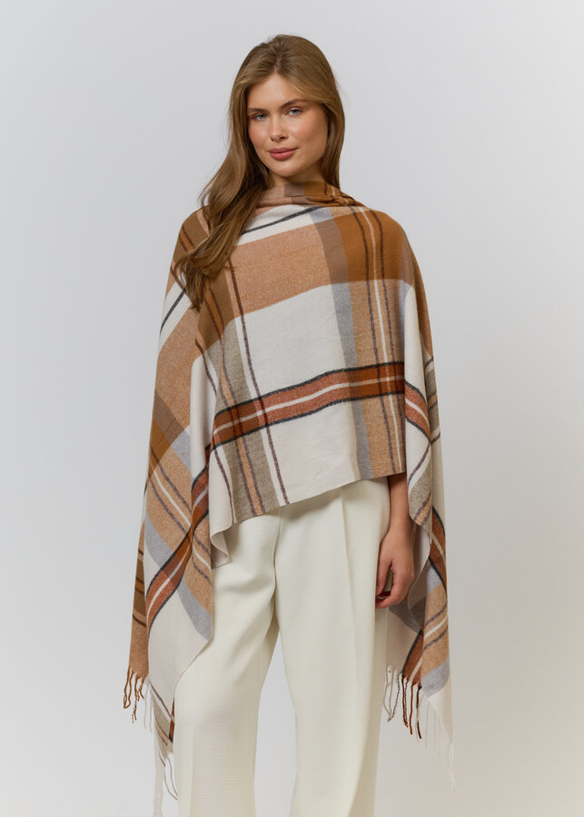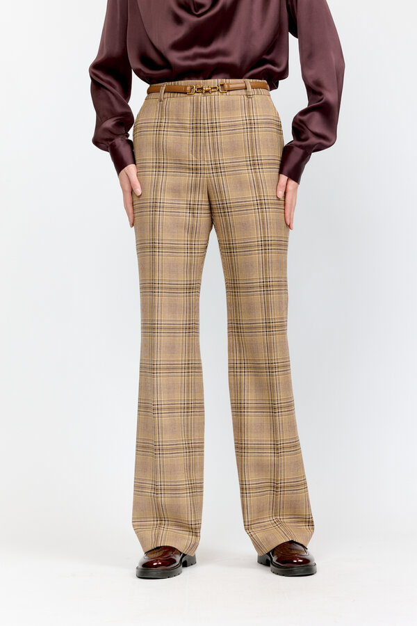 64 Брюки зауженные книзу длиной до щиколотки. Костюмная ткань в бежево-зеленую-коричневую клетку (69% п.э., 29% район, 2% спандекс) 2850 1500