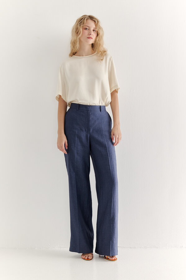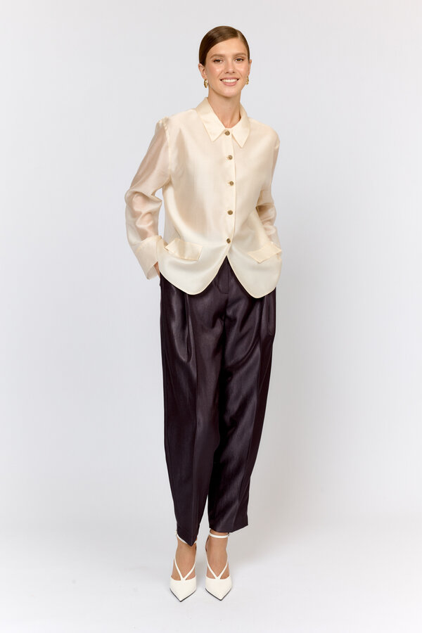 39 Стильные силуэтные брюки на любой для нарядных и элегантных образов. Стрелки придают силуэту изящество, зрительно вытягивая ноги. Комфортное сочетание шерсти, шелка и вискозы обеспечивают идеальную посадку и сохраняют тепло и уют. NEW PREMIUM QUALITY Костюмная ткань с шерстью и шелком премиального качества жемчужного цвета (67%п.э., 20%вискоза, 4%шелк, 4%шерсть, 5%спандекс) 4500
