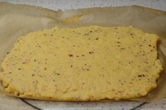 Затем добавить масло, перемешать и выложить на бумагу тонким слоем.