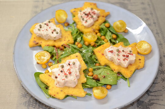 У нас сегодня гренки из кукурузой поленты. Я их подала в виде салата.