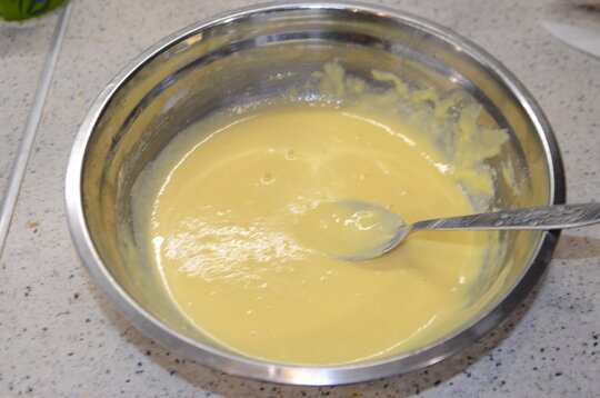 2. Добавила муку, смешанную с содой. Мне кажется, что муки всё-таки маловато, тесто слишком жидкое получилось.