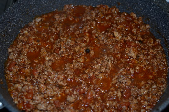 Лук порезать, обжарить, добавить фарш, обжарить, добавить помидоры, воду, специи, сахар, соль, дать потомиться где-то 30 минут.