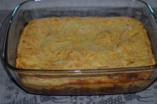 Выкладываем фарш в форму, сверху выкладываем тесто. Посыпаем сыром, убираем в духовку. Готовим при 180 градусов где-то 30-40 минут.