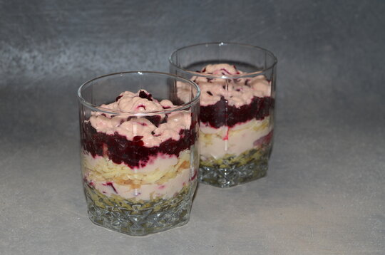 На дно стакана выкладываем слоями картошку, лук, майонезно-икорную заправку, яблоко, сыр, майонезно-икорную заправку, свёклу, украсить заправкой.