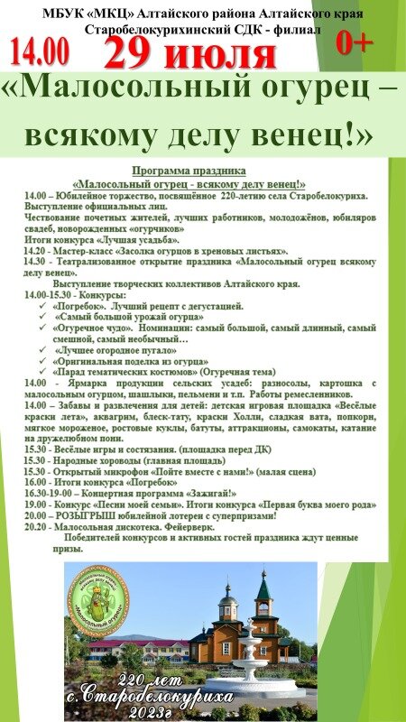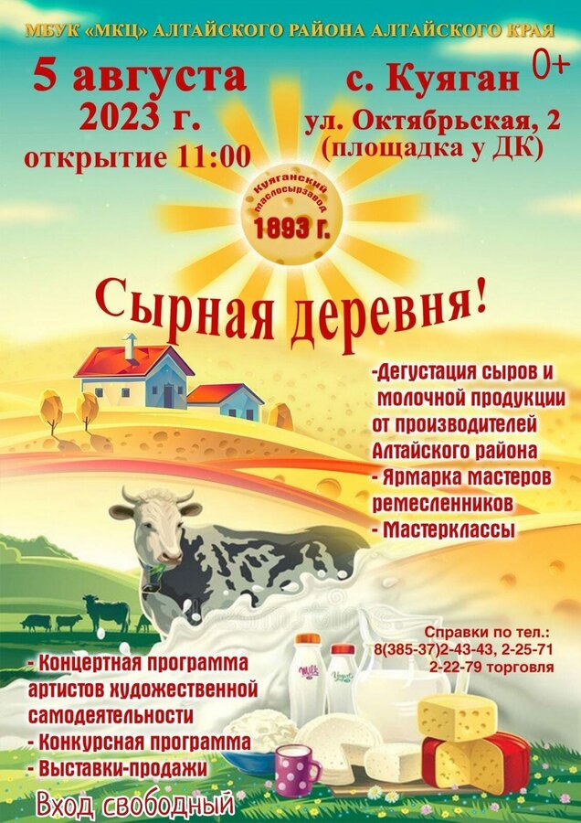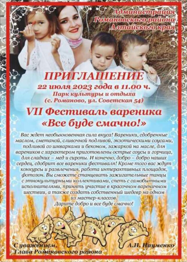 29 июля с 15 до 23 часов в селе Киприно Шелаболихинского района состоится межрайонный фестиваль «Как сыр в масле!», сообщает пресс-служба правительства региона.