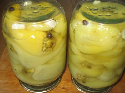 После очистки, перец добавить в горячий маринад и проварить минуты 2-5, разлить по стерилизованным банкам и закрутить, в банки можно добавить чеснок, острый перец, базилик, петрушка, итальянские травы все по вкусу.