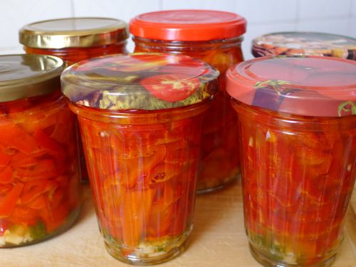 Добавить 200 г. сахара, 2 ст. ложки соли, 200 г. растительного масла, 2 головки чеснока (если головки большие, то поменьше) подавить, стручок горького перца (для тех, кто любит поострее) и кипятить еще 7 минут. Затем добавить 2 кг. порезанного перца (я режу длинными полосочками) и кипятить еще 20 минут. Горячим разлить по банкам и закатать.