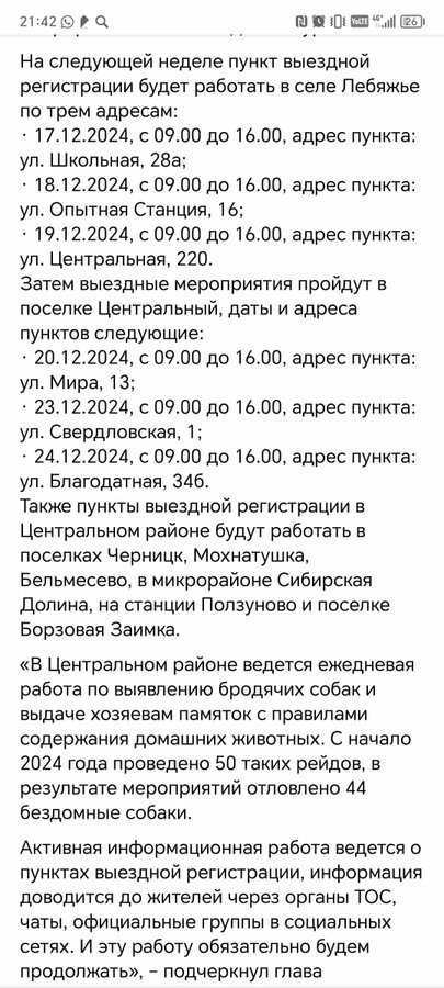 Данная услуга предоставляется в г. Барнауле в государственных ветеринарных клиниках по адресам: ✅ул. Шевченко 158, ✅ул. Короленко 109 (постоянно в соответствии с графиком работы учреждения), а также будет организована выездная регистрация по районам и поселковым администрациям нашего города. Графики можно уточнить в администрации Вашего муниципалитета.
