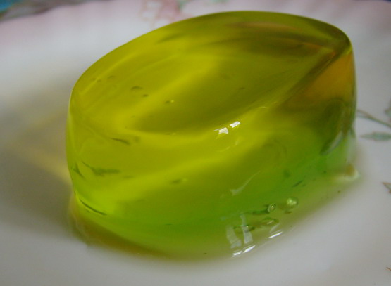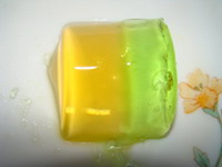 Верхний слой персиковое желе (покупала готовый пакетик, осталось только развести и заморозить), второй - яблочный сок, плюс немного лимонного, желатин и зелёный пищевой краситель (остался пакетик с пасхи :-) ) Муж и доча в восторге! :love!: Мне тоже очень понравилось, освежает в жару. Вообще слои чётко разделялись, на первом фото почему-то не видно, специально сфотала последний кусочек, оставшийся на тарелке, прежде чем доесть :-P