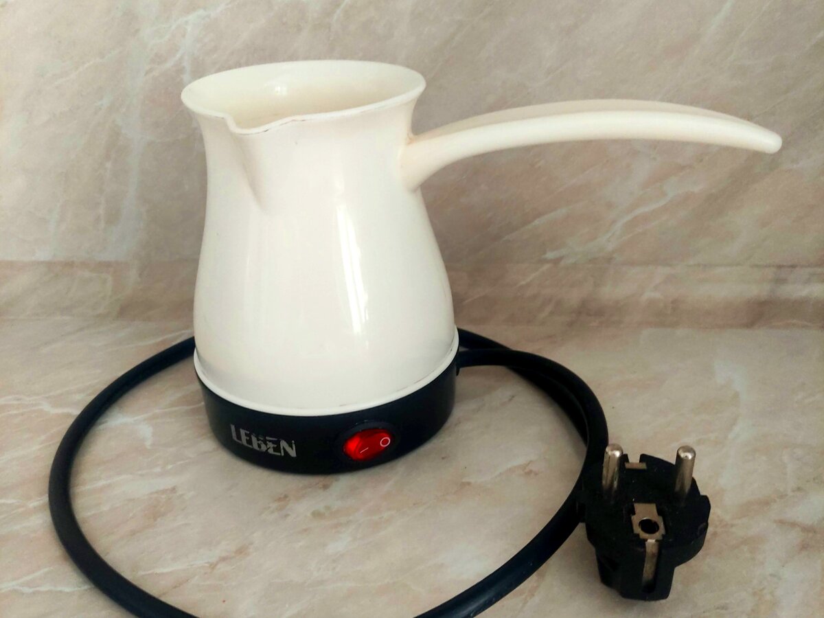 Турка электрическая б/у мало. 350 мл максимум. Жаропрочный пластик. Шнур не отделяется! Работает от сети, отключать нужно вручную! Закипает быстро. Очень удобно в поездках/командировках. Говорят, что даже яйца можно варить. 450 руб.