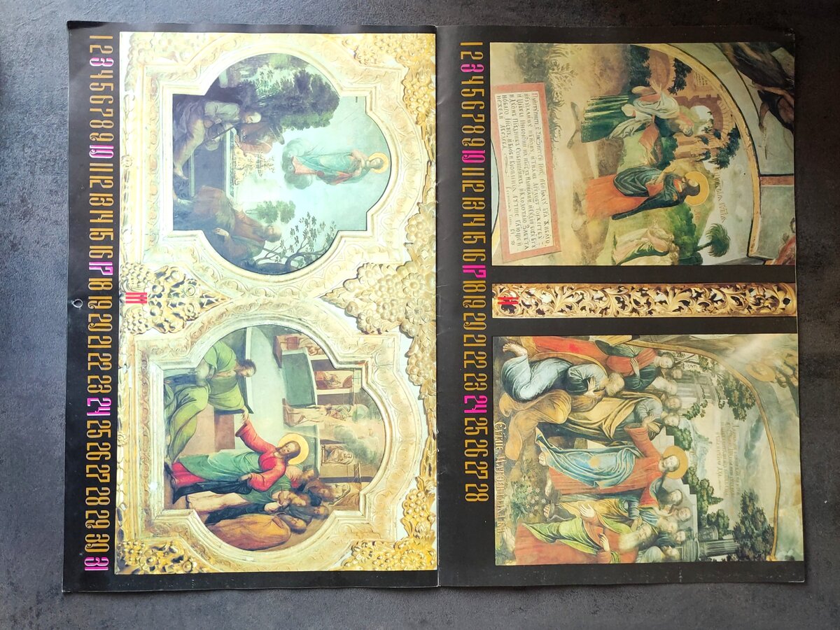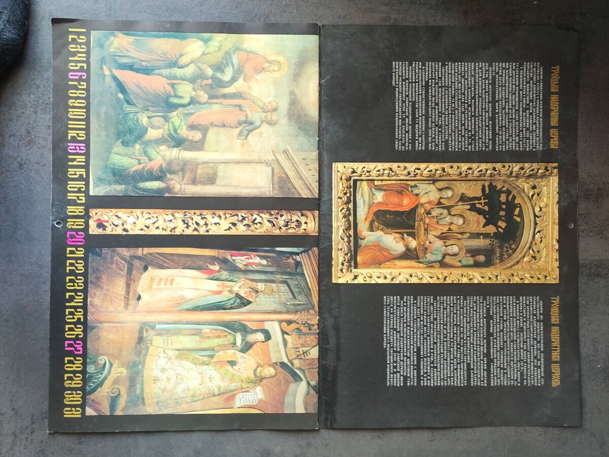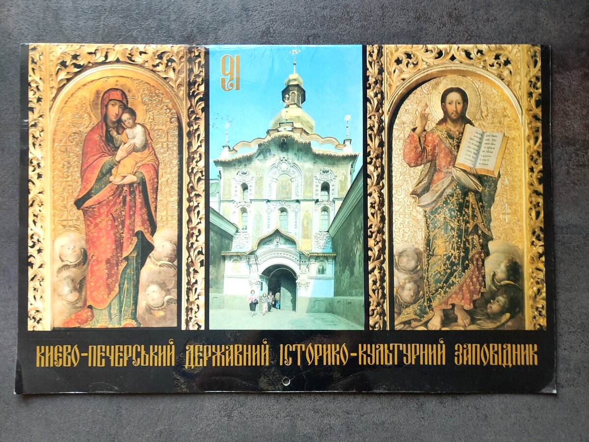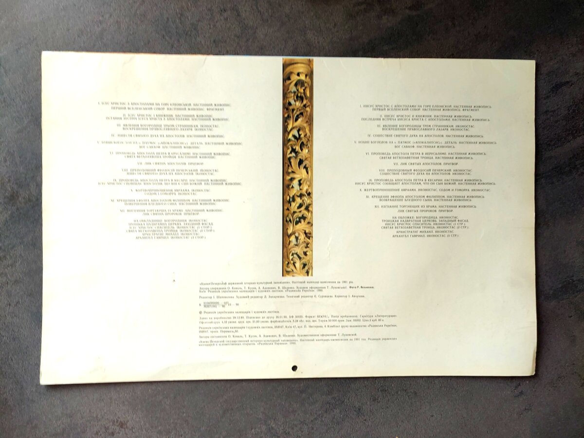 Настенный календарь на 1991 год. Киево-Печерская лавра. Редкость. Размер в развернутом виде 44х58 см. Всего 8 листов/16 страниц. Отверстие для гвоздика, чтобы вешать. Примята обложка, других повреждений не вижу. Привезли из Киева в 1990 году.