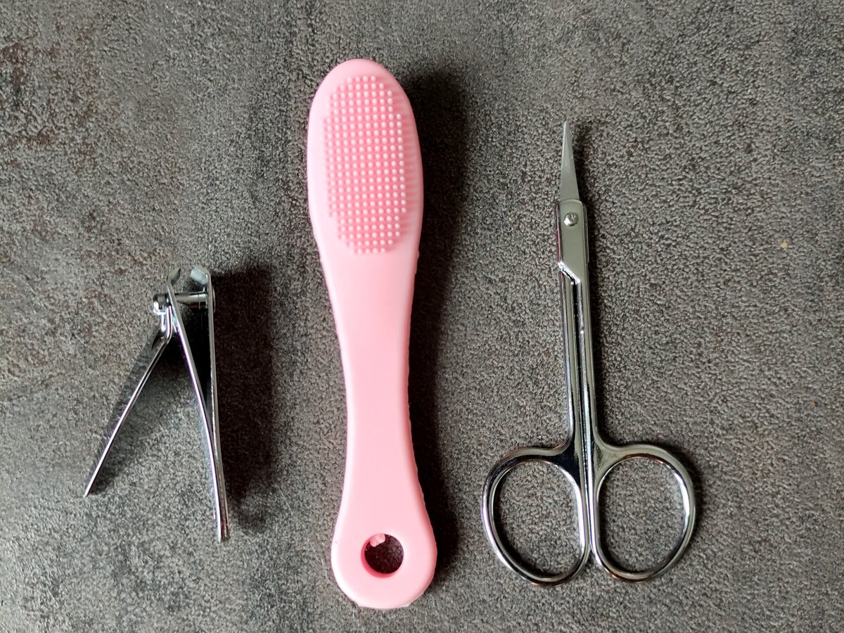 Новые мелочи из разных наборов: ножницы маникюрные, кусачки (или что это?), силиконовая щеточка для умывания.