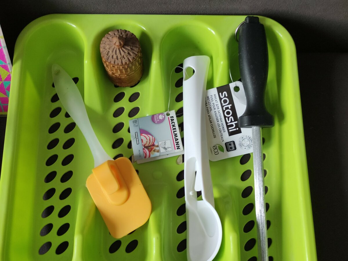 Лоток-сушилка для столовых приборов почти новый. 33х26х4,5. Ложка для мороженого новая пластиковая и мусат дешевый б/у пару раз. Я не понимаю, как этим пользоваться.