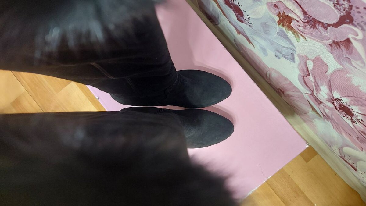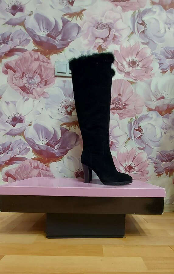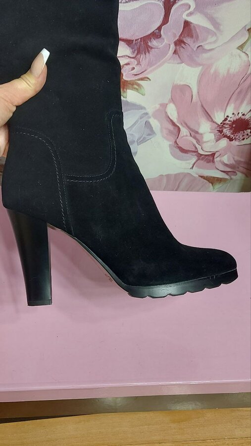 Б/у в очень хорошем состоянии. Нат. замша. Каблук 8 см Колодка ооочень удобная. Каблук не чувствуется.Подкладка велюр.