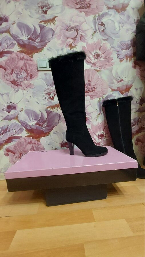 Новые! Высокие сапоги (плотная качественная замша). Размер 41 на 40. С густющим мехом еврозима. Каблук 10,5см. Полнота - обхват по голенищу 38см. Изящные, нарядные,- как сапоги Снегурочки. Отдам за 6500₽.