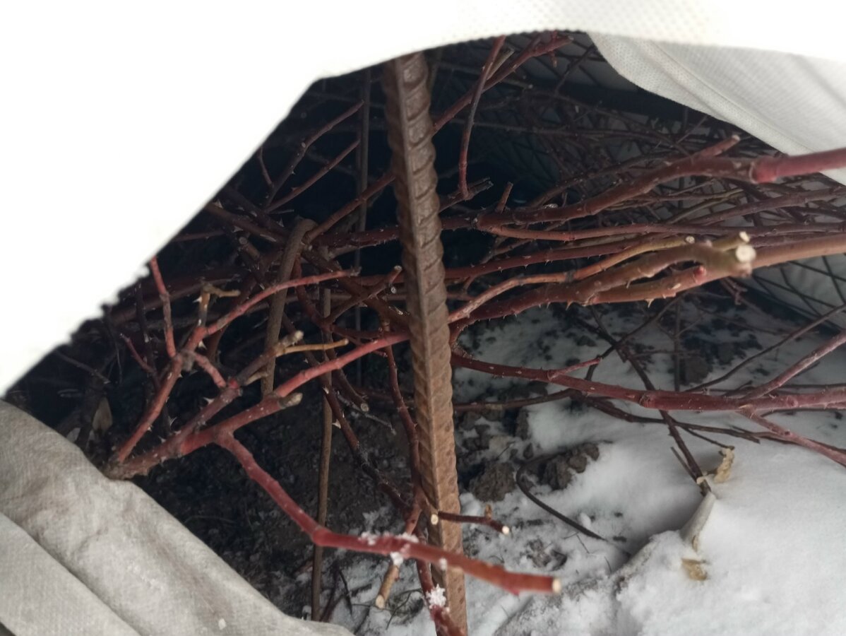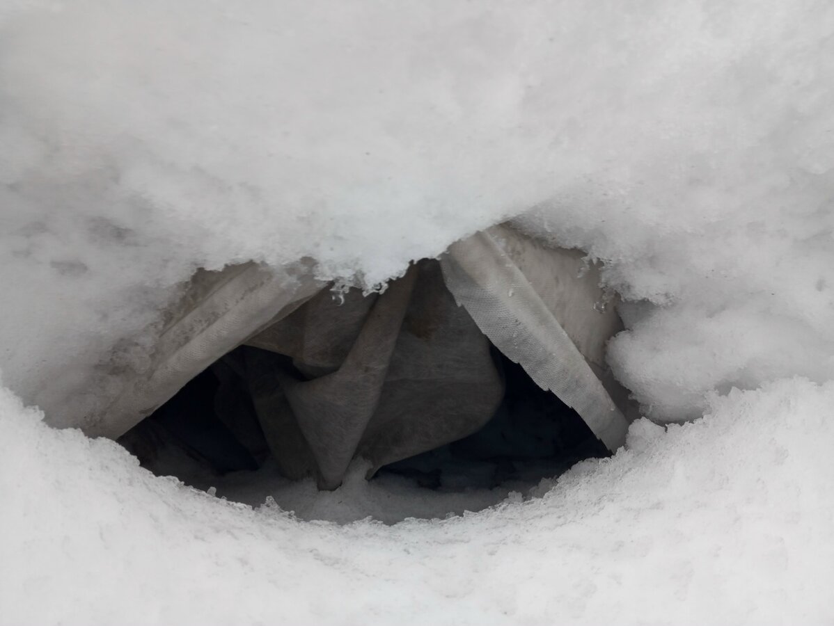 Неприятный сюрприз оказался в том, что у одного широкого тоннельного укрытия (с двух сторон) и у одного узкого (с одной стороны) слетел, а скорее всего был сдернут укрывной с торцов. Думаю, что это работа соседских котов. Есть у них привычка захаживать в "розовые домики."В общем напихала в зияющие дыры чего не попадя, начиная от кусков старого укрывного и заканчивая сахарными мешками и полиэтиленовой плёнкой ( родные куски укрывного примёрзли намертво у земли, не оторвать) и засыпала снегом.