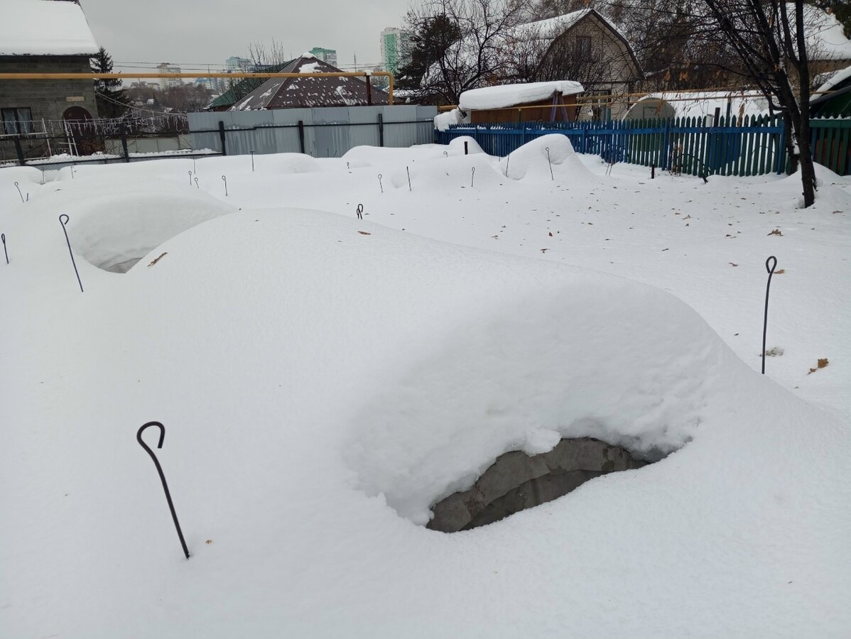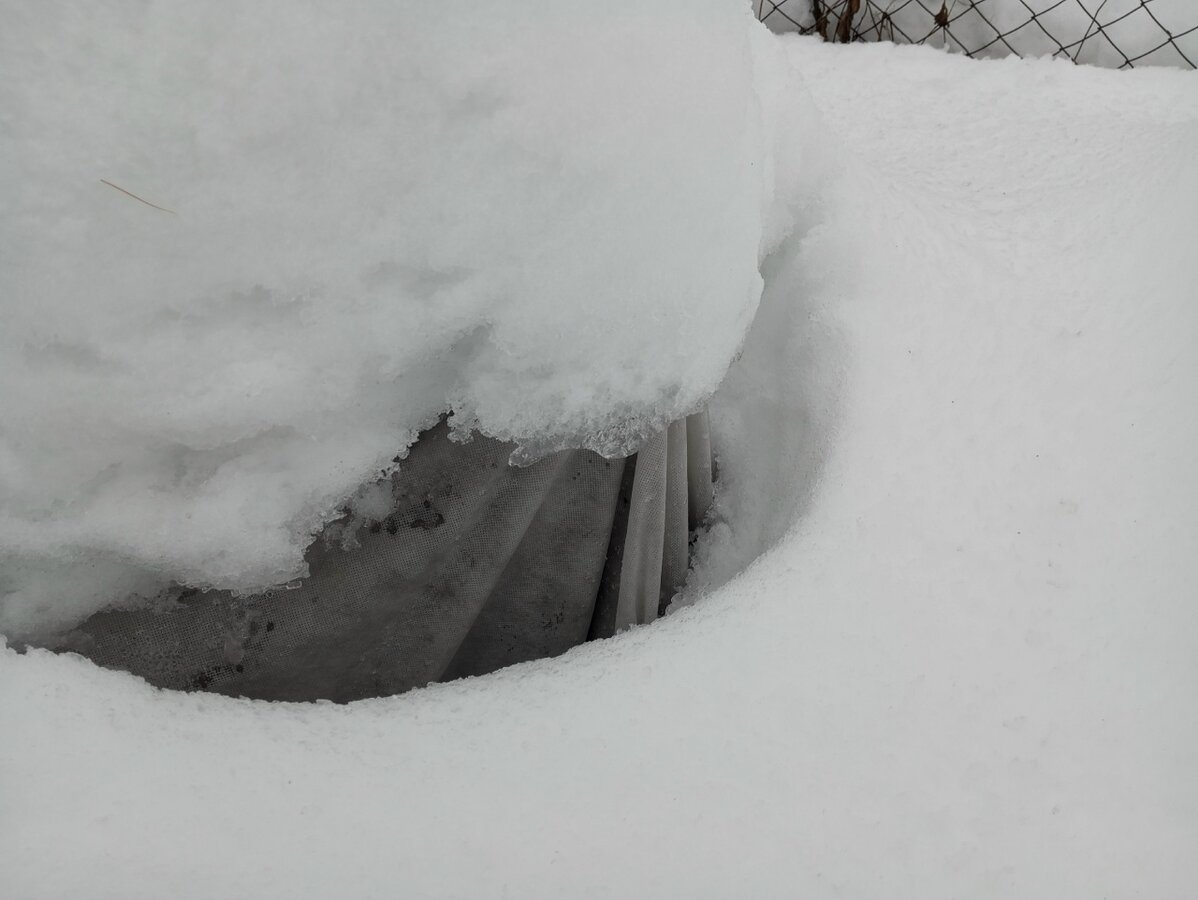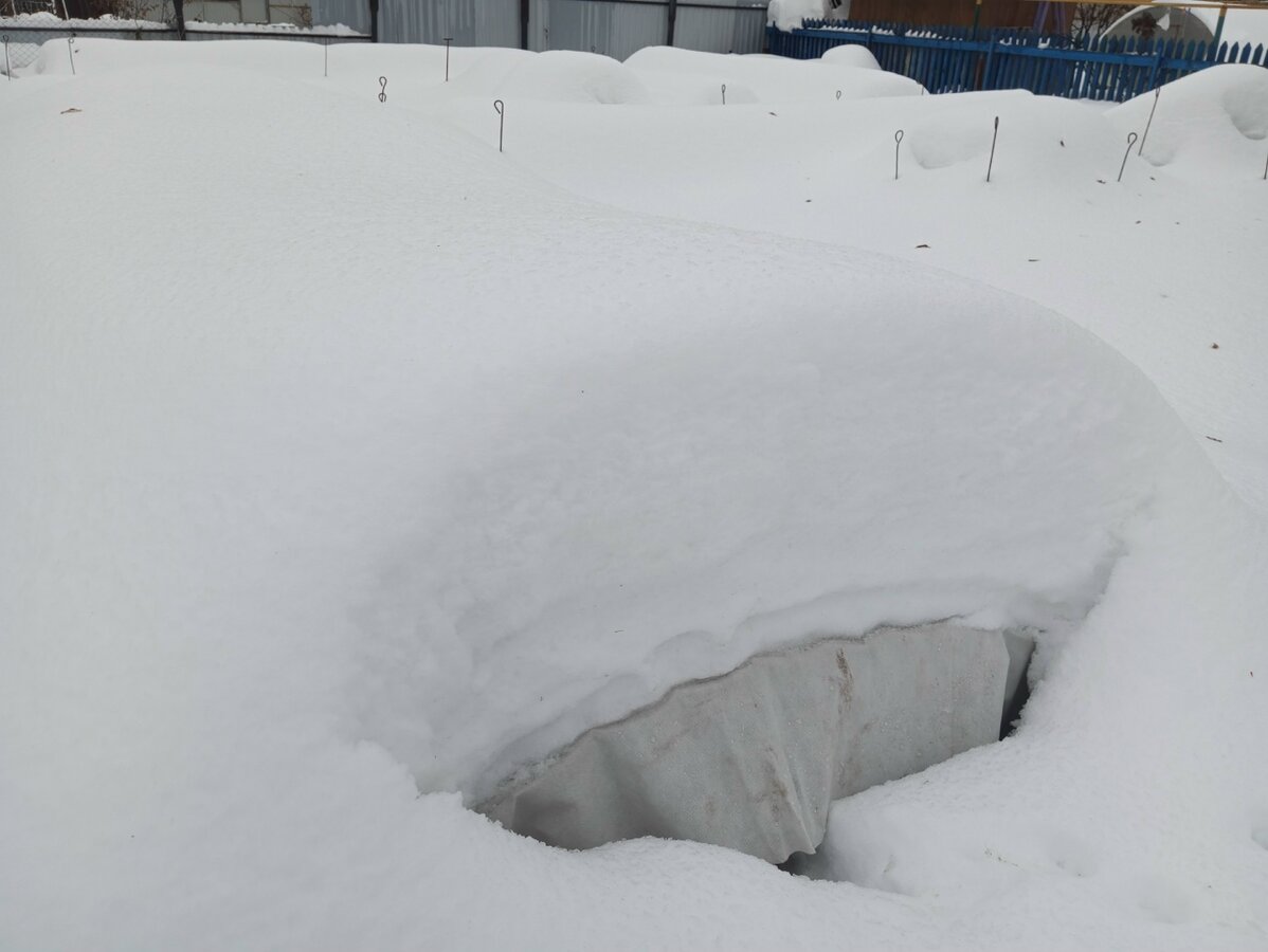 Мы съездили на дачу, чтобы сбросить снег с теплицы и закидать торцы укрытий, если понадобиться. И оказалось не зря. Снега много, но торцы не до конца засыпало у некоторых укрытий. Это, конечно, не критично.