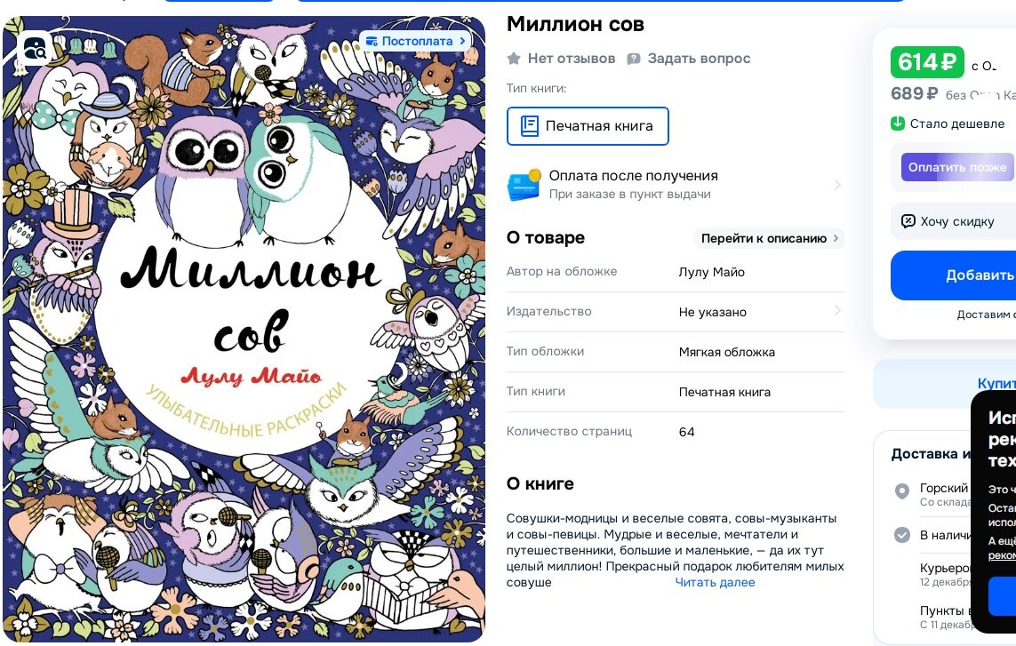 Одним лотом (в одни руки) раскраски-"зендудлы": Миллион сов и Котомудрости.