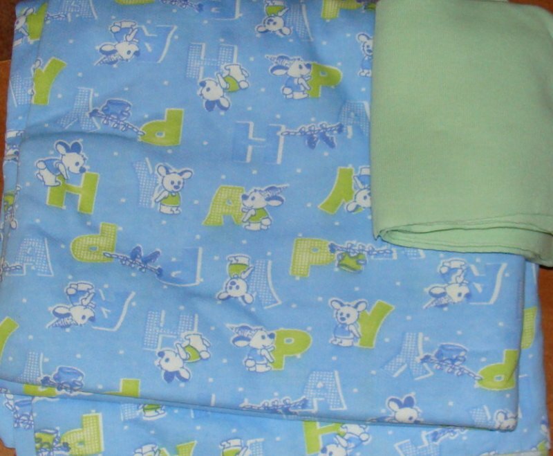 Трикотаж футер с детским рисунком и компаньон к нему - трикотаж рибана нежно-зеленый. В одни руки.