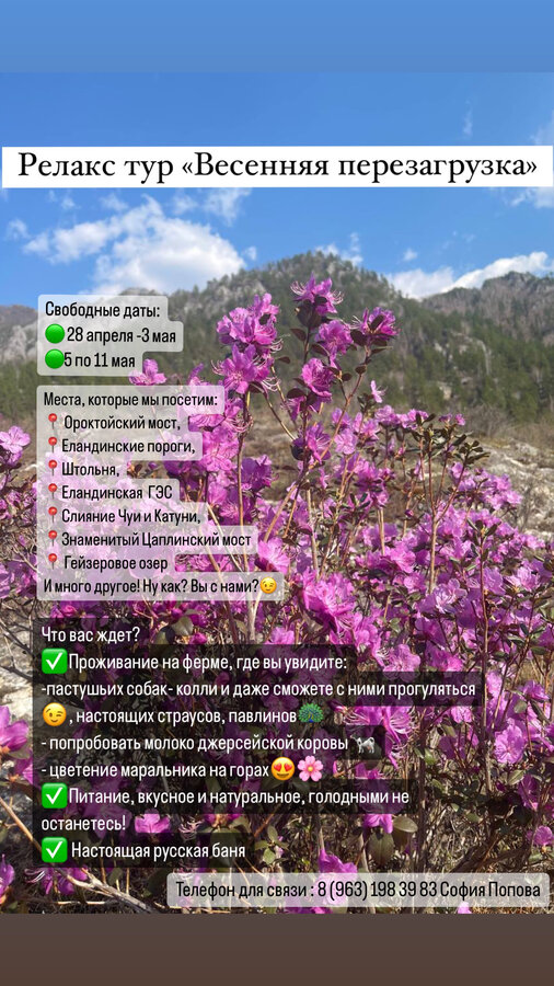Всем привет,у нас для вас много предложений и информации -есть возможность составить тур на майские,пожить на Экоусадьбе жар -птица. Также есть некоторые свободные даты на майские на отдельный гостевой дом в с Чемал)