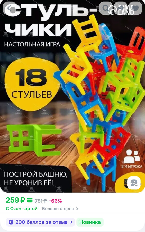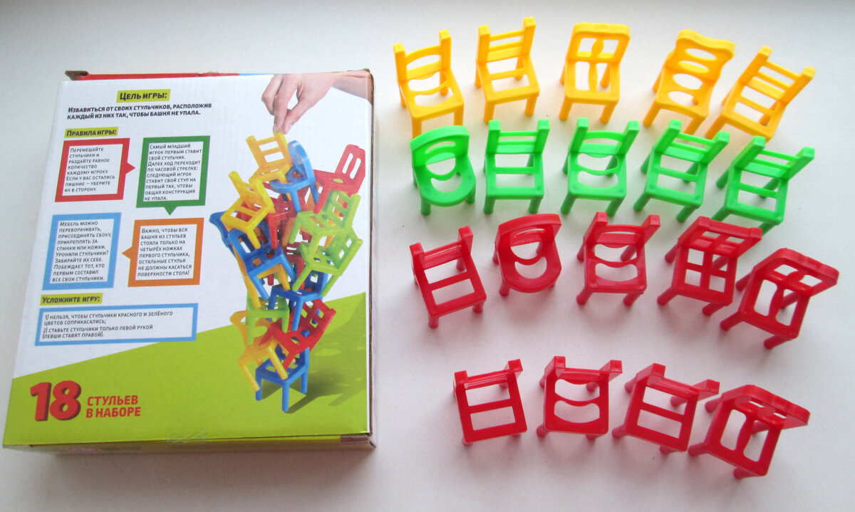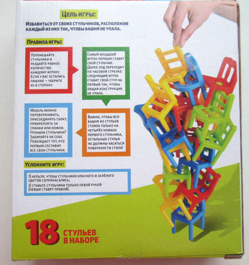 Задача каждого игрока — избавиться от своих стульчиков, расположив каждый из них так, чтобы башня не упала.