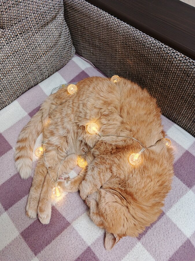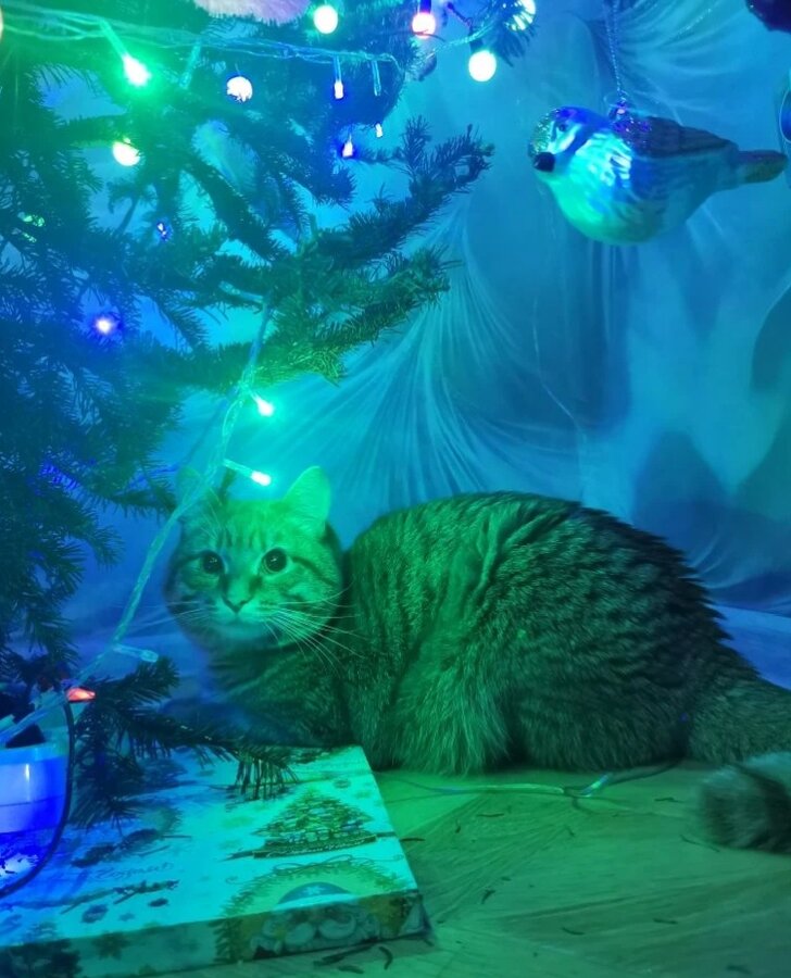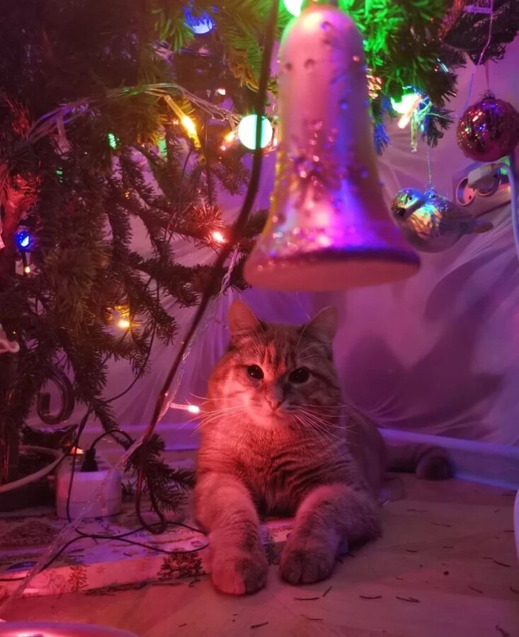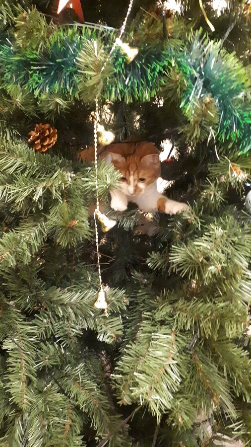 Ни одна пушистая пакость кошка не пострадала, все отделались лёгким испугом: и мы,и ёлка,и кошка.