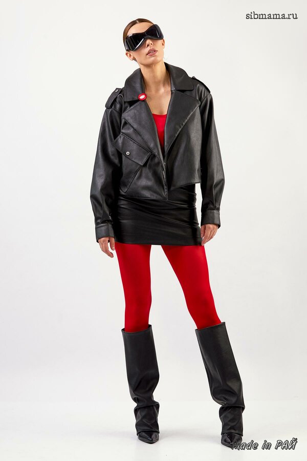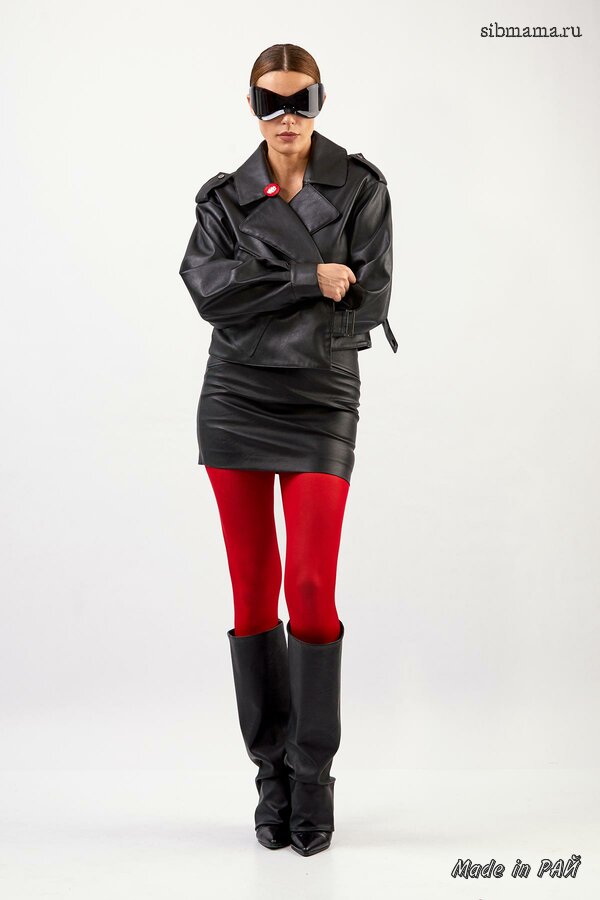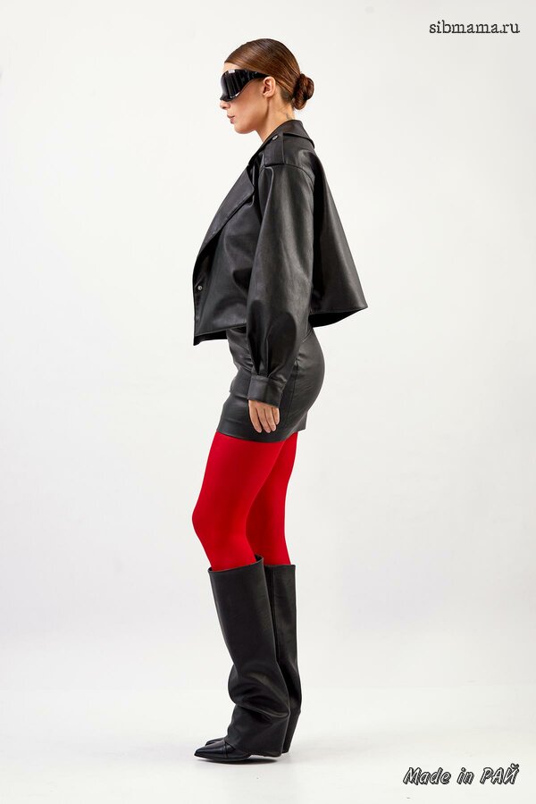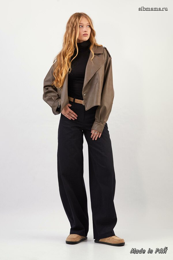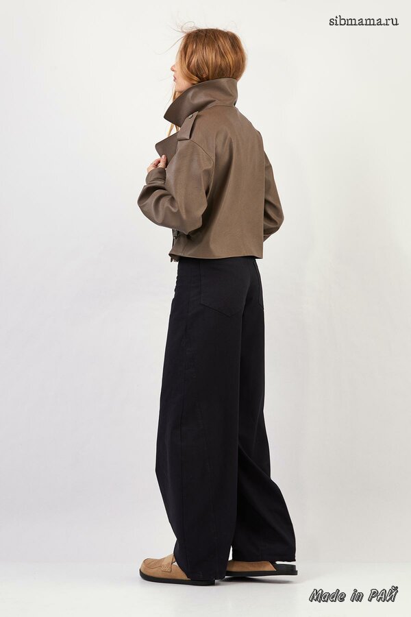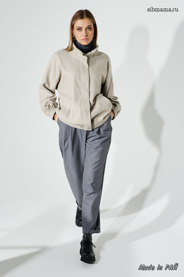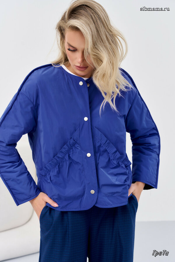Короткий двухсторонний жакет из плащевой ткани с синтепоном между слоями, прямого силуэта со спущенной линией плеча; с фигурным закруглением борта. Перед с центральной бортовой застёжкой на металлические кнопки. Модель без воротника. Для удобства в носке предусмотрены накладные фигурные карманы. Длина изделия 60см; длина рукава от горловины 72см.