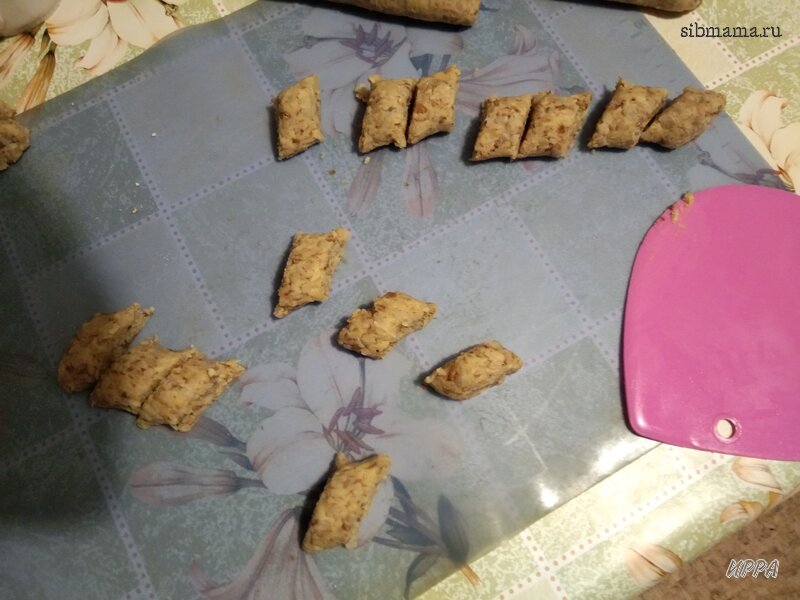 Разделила его на 4 части, скатала в колбаски и разрезала шпателем на кусочки